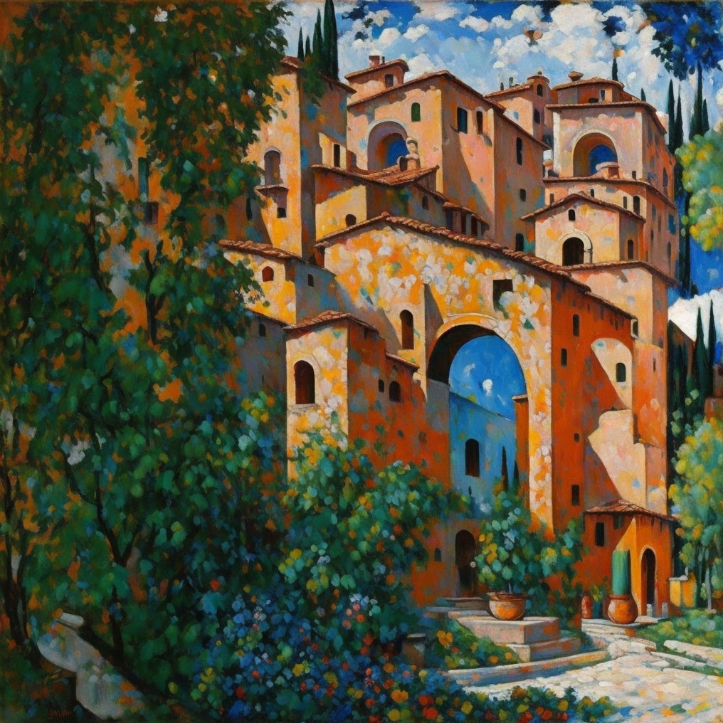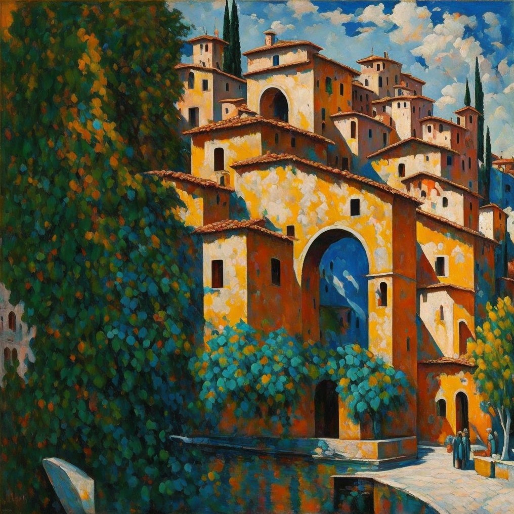 Vibrant Painting of a Sunlit Hillside Village Scene