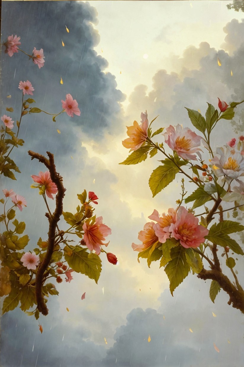 + Prompt:Year 1770. Wind and rain in a majestic Royal yard. August. Beautiful wild flowers and berries and gorgeous architecture. Atmosphere of a 18th century beautiful city. Beautiful sunset through the clouds. Gorgeous Rococo tile. Petals in the wind. High contrast. Wet on wet watercolour. By Jean Baptiste Monge & Jacob Van Ruisdael