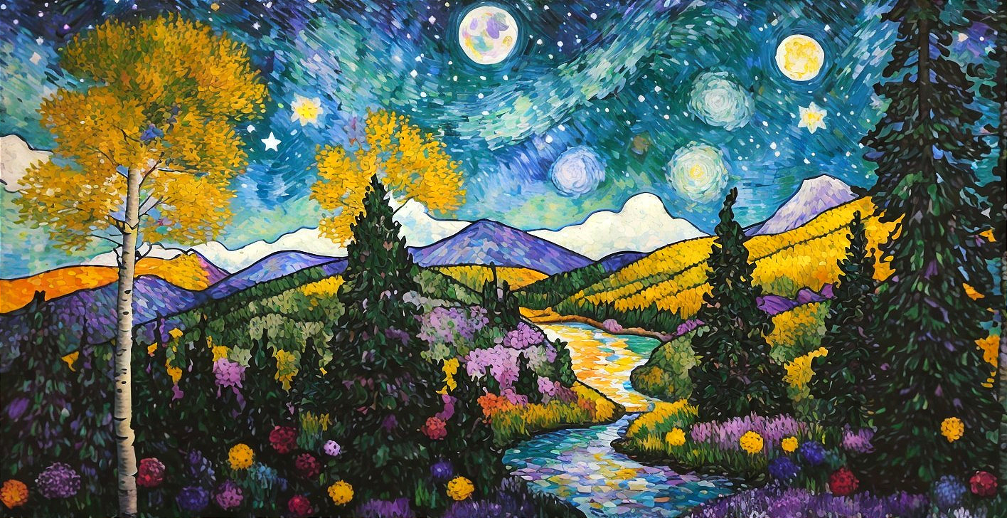 highland flower spectacular, pines and beautiful aspen trees by a river, cosmic night sky with a full bright large moon and stars, made of mixed media, acryllc, stained glass and metallic paints
