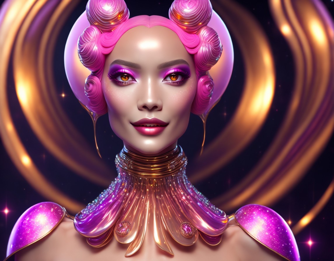 A glassy unusual looking alien lady with large amber sparkling eyes and luscious pink lips. She is beautiful but otherworldly with a warm smile
