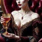 A captivating painting depicts a female vampire, her pale skin contrasting sharply with her dark hair and striking features, seated regally in a plush, ornate golden and crimson armchair. She has a seductive gaze, with piercing yellow eyes, dark eyebrows, and dark red lipstick on her full lips. Her black hair