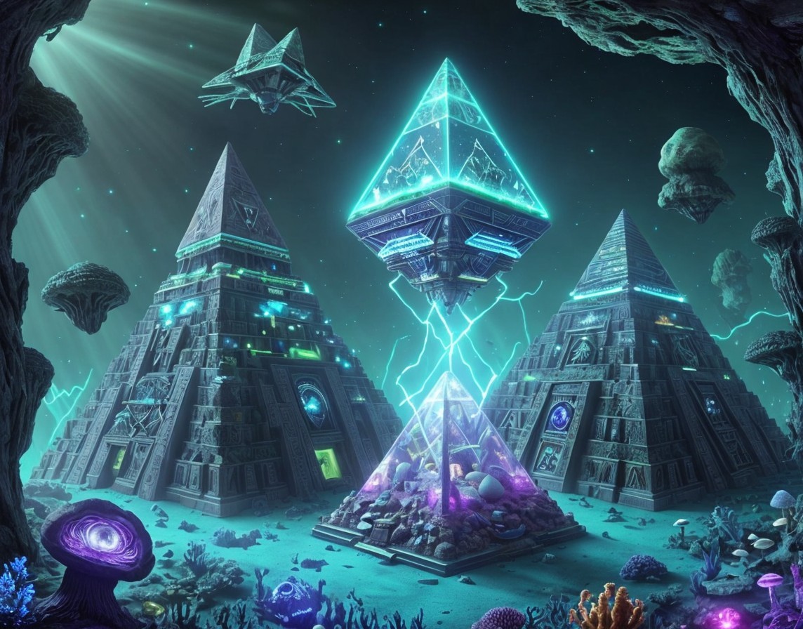 Prompt: Extraterrestrial menagerie pyramid intertwined with advanced alien technology in a deep-sea aquatic landscape with coral reef, mushrooms, crystals and fish. Underwater pyramid, astral projection, UFO in front of 3D-rendered bioluminescent mushrooms and colossal crystals. Picture a time-traveling alchemist surrounded by symbols like sacred geometry, mystical occult imagery (hamsa, eye of providence), talismans, esoteric tarot cards, and the all-seeing eye. Realistic and natural elements, under a cosmic sky. alien plants, psychedelic elements like galactic DMT entities, hallucinogenic vibes, shamanic horror LSD art, and the ethereal DMT realm. In the style of Cameron Gray