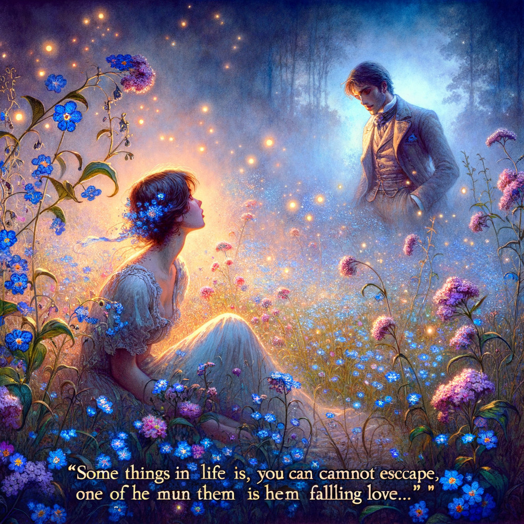 Forget-me-nots flowers. Less detailed. A beautiful couple. watercolour on silk, foggy in the background, Mystery, style by Thomas Wells Schaller, Maxfield Parrish and Ivan Bilibin, magical, elegant, beautiful, colourful, bioluminescent highlights and atmosphere, crisp quality, Daniel Merriam art station. Mystery. acrylic art, Art Deco, Annigoni, Egon Schiele, Botticelli, Catrin Welz-Stein, intricate, elegant, digital painting, concept art, smooth,Nikon D850 highly detailed intricate beautiful dynamic lighting 3D Award winning photography fantasy 8k beautiful sharp focus fantasy ethereal crisp quality magical translucent Strange Flowers growing in a mystic evening landscape. Style Kuri Huang, Abel