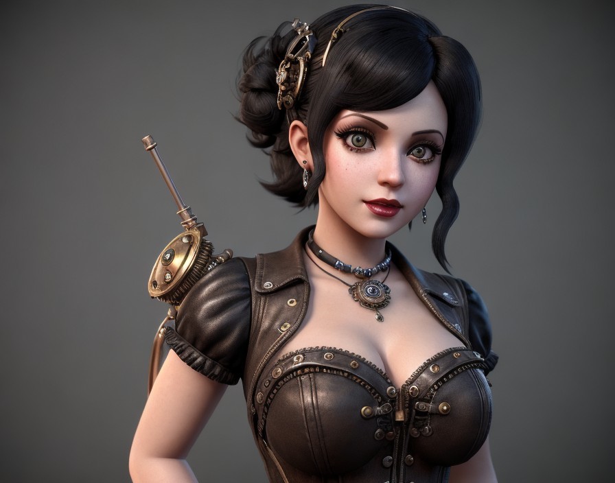 Steampunk-themed woman in 3D render with headphones, jewelry, and timepiece
