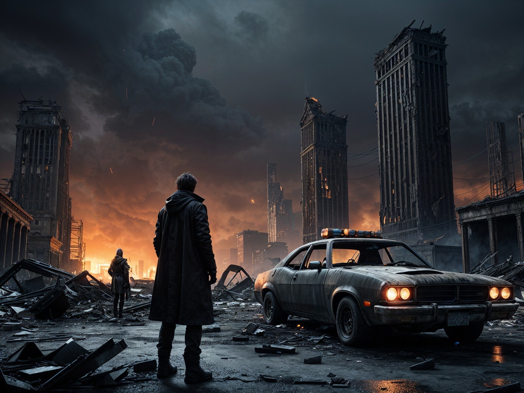 In a post-apocalyptic cityscape, two figures stand amidst the ruins. Skyscrapers burn under a stormy sky, while abandoned cars line the debris-strewn street, evoking a sense of desolation.