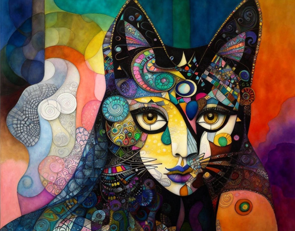 A vivid, colorful artwork of a cat with intricate patterns and human-like eyes against a multicolored geometric background.