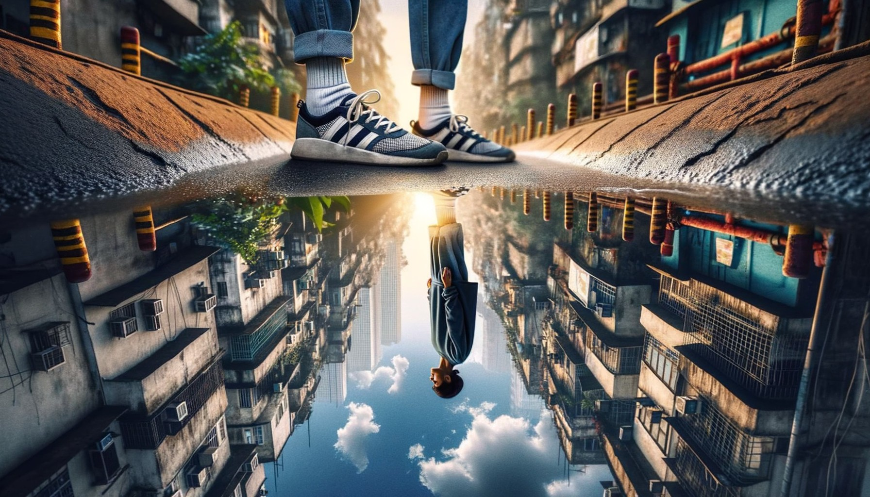 A person stands beside a puddle reflecting a cityscape, creating a surreal image. Their stylish sneakers contrast with the urban environment, while clouds drift in the vibrant sky above.