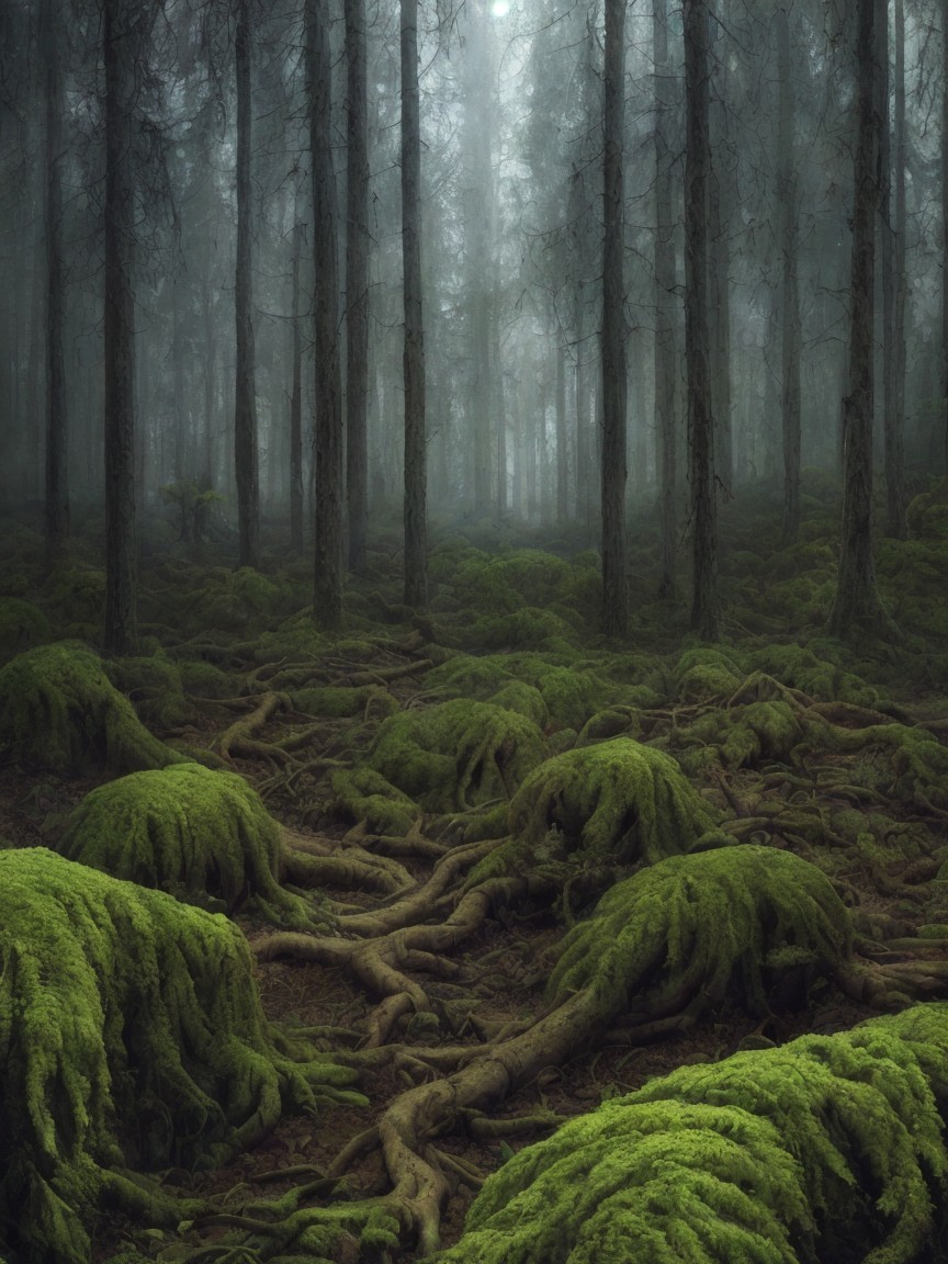 In a foggy, enchanted forest, twisted trees loom with moss-covered branches. A mysterious creature, part dragon, part wood, emerges, its fierce eyes glowing amidst the eerie wilderness.