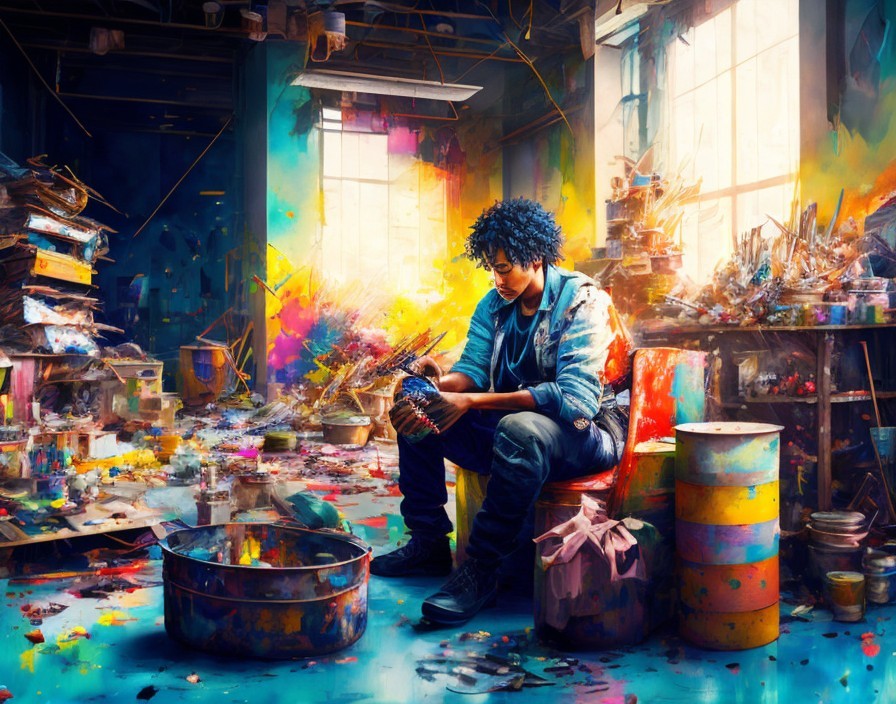 Prompt: "Dynamic scene with a person sitting in a workshop, surrounded by signs of mistakes like spilled paint and skewed structures. Their expression is determined and positive, symbolizing learning through errors. Background transitions from chaotic to harmonious, with whimsical elements like floating ideas and imaginative creatures, embodying Neil Gaiman's quote on embracing mistakes for growth and transformation"