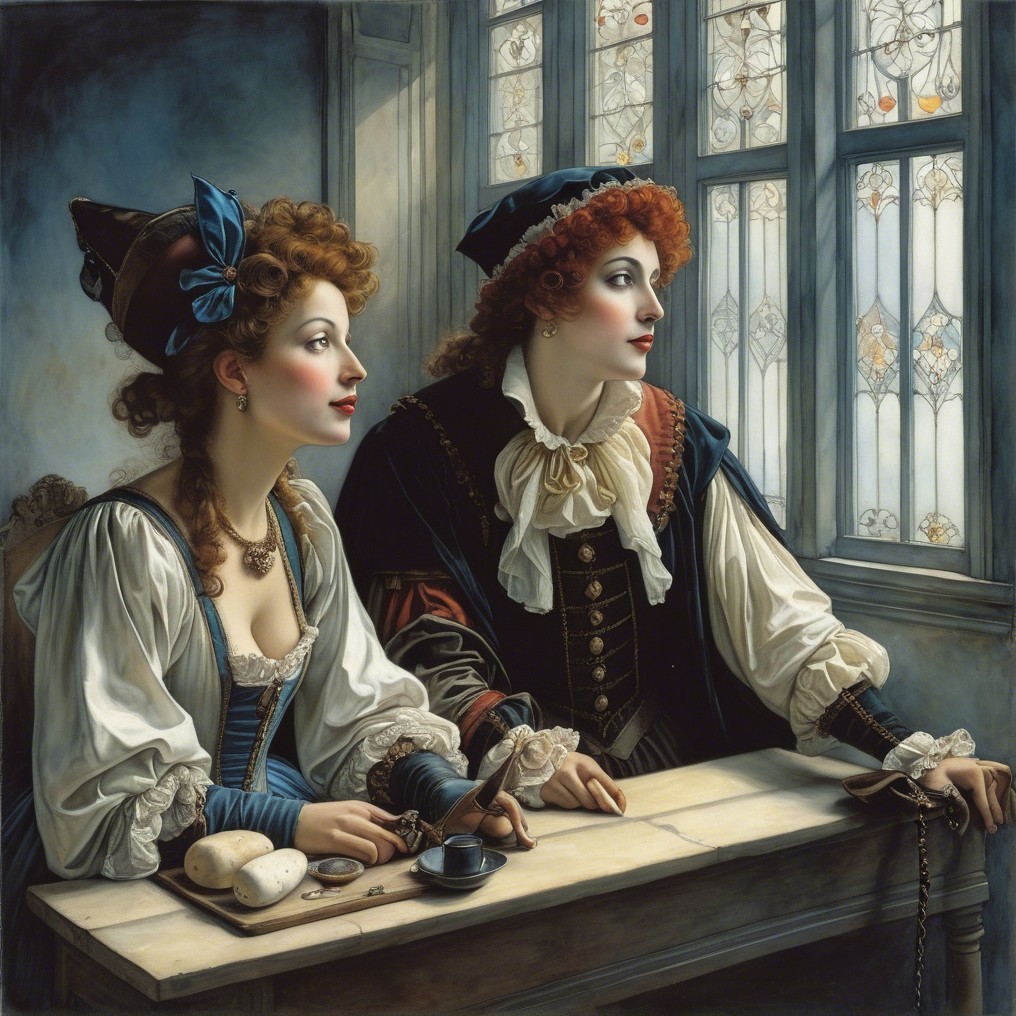 The image features two elegantly dressed women in historical attire, gazing thoughtfully out of a window. Rich fabrics and intricate hairstyles reflect a refined atmosphere, highlighting their grace.