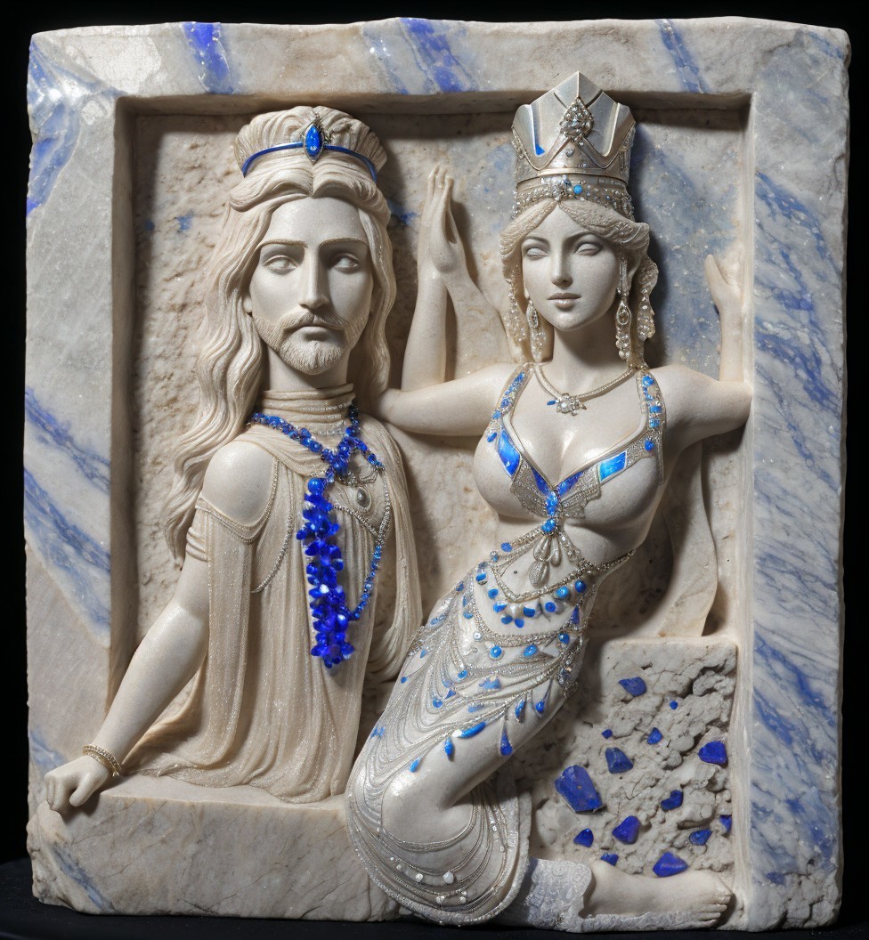 The image features a detailed stone relief depicting a king and queen, adorned with intricate jewelry and blue accents. Their elegant poses and expressions convey a regal and mystical aura.