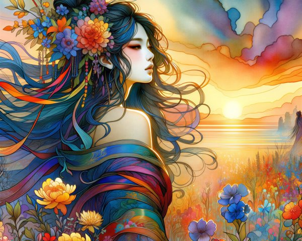 A silhouette of a woman by a tree, with a serene lake, flying birds, and a vivid crimson and blue sky.