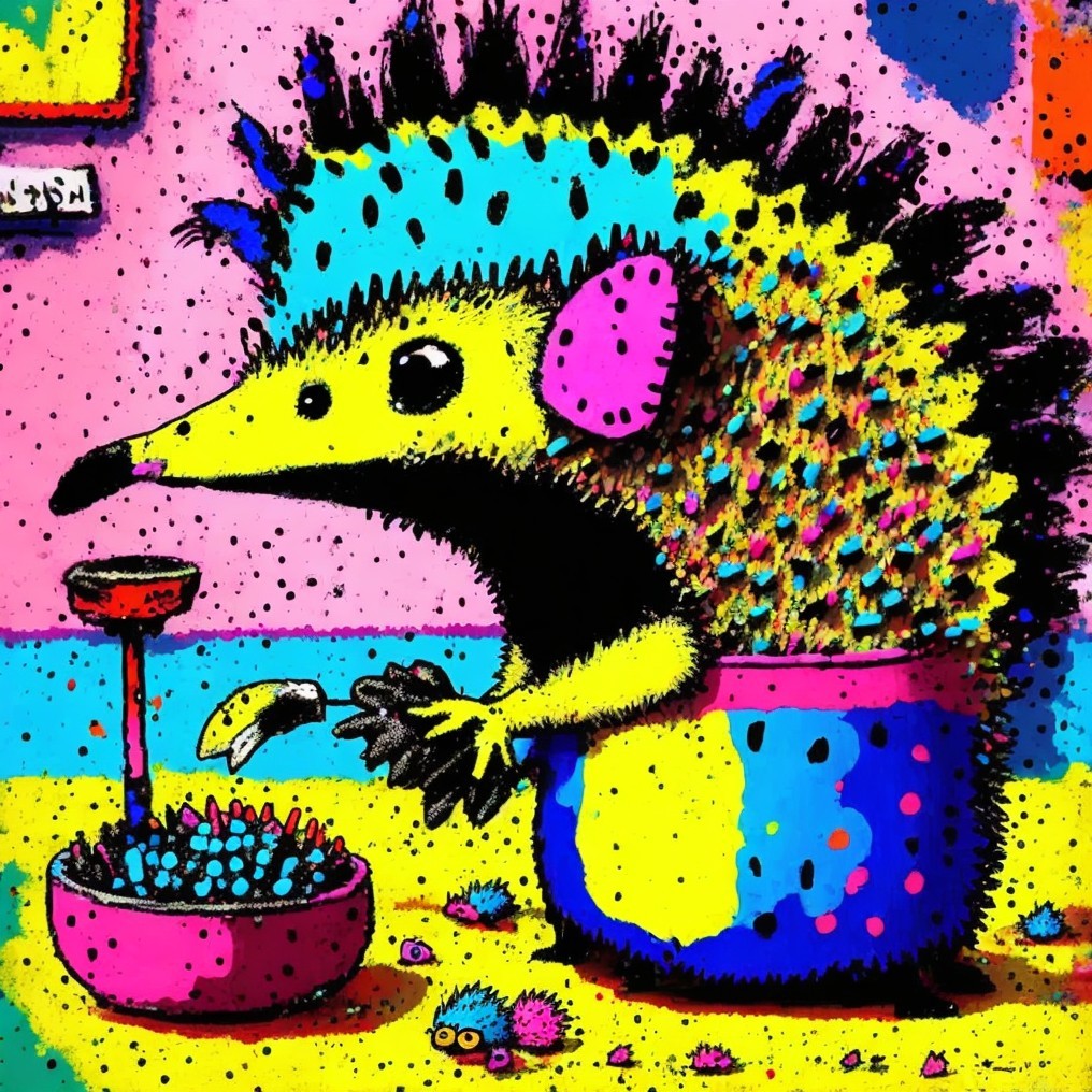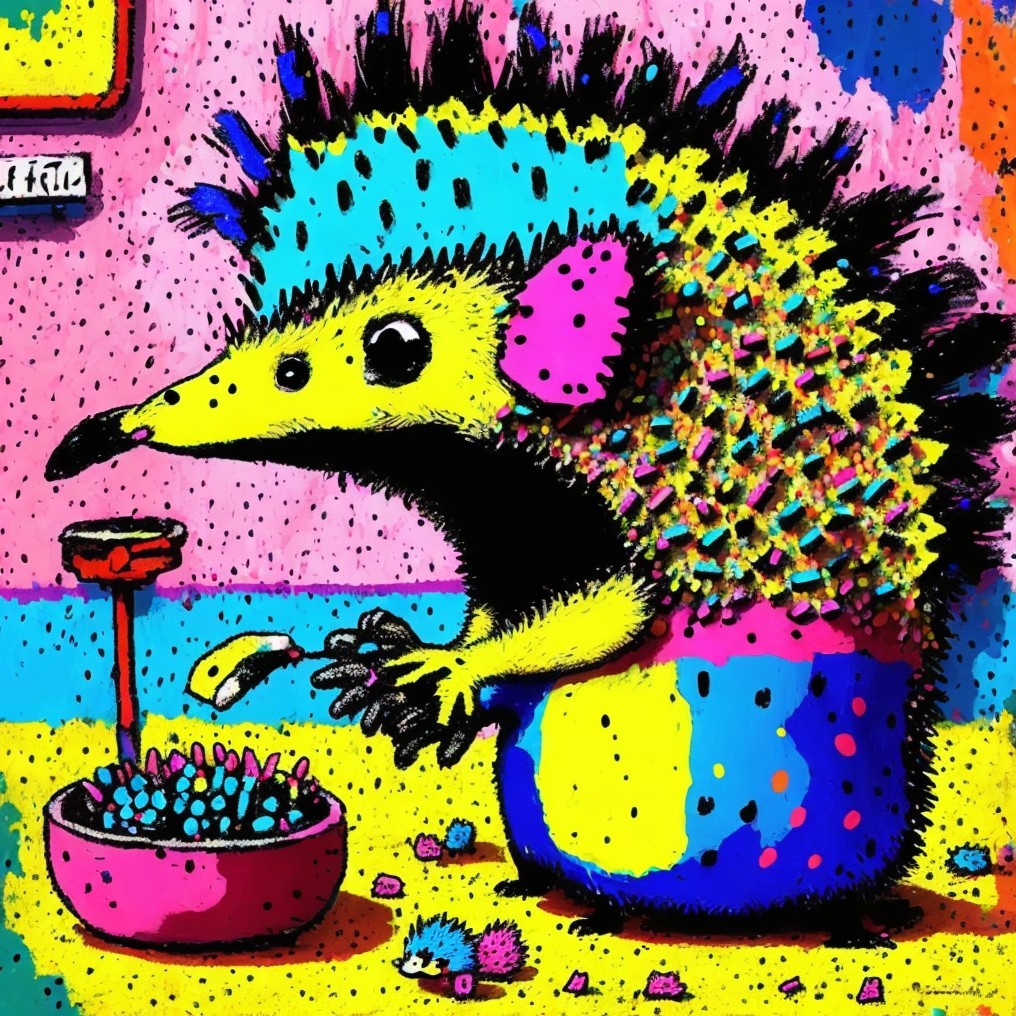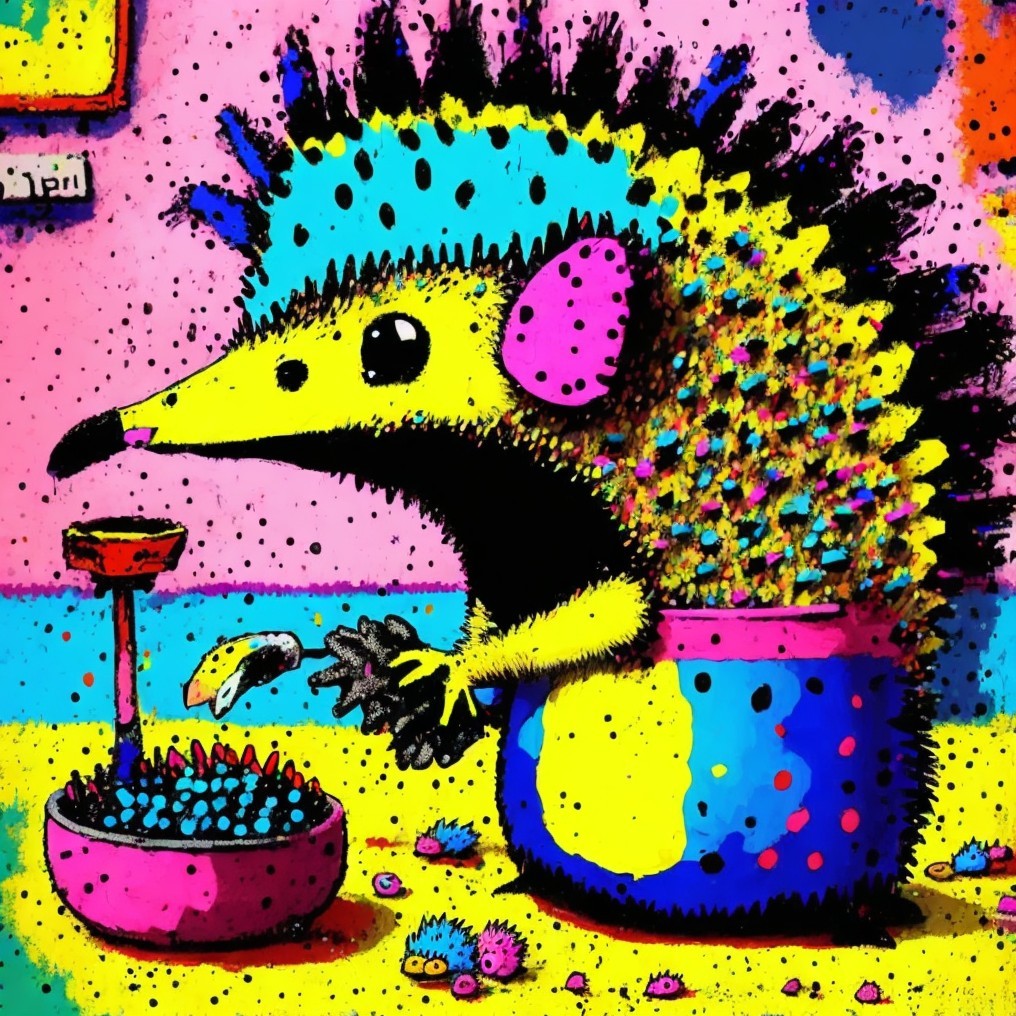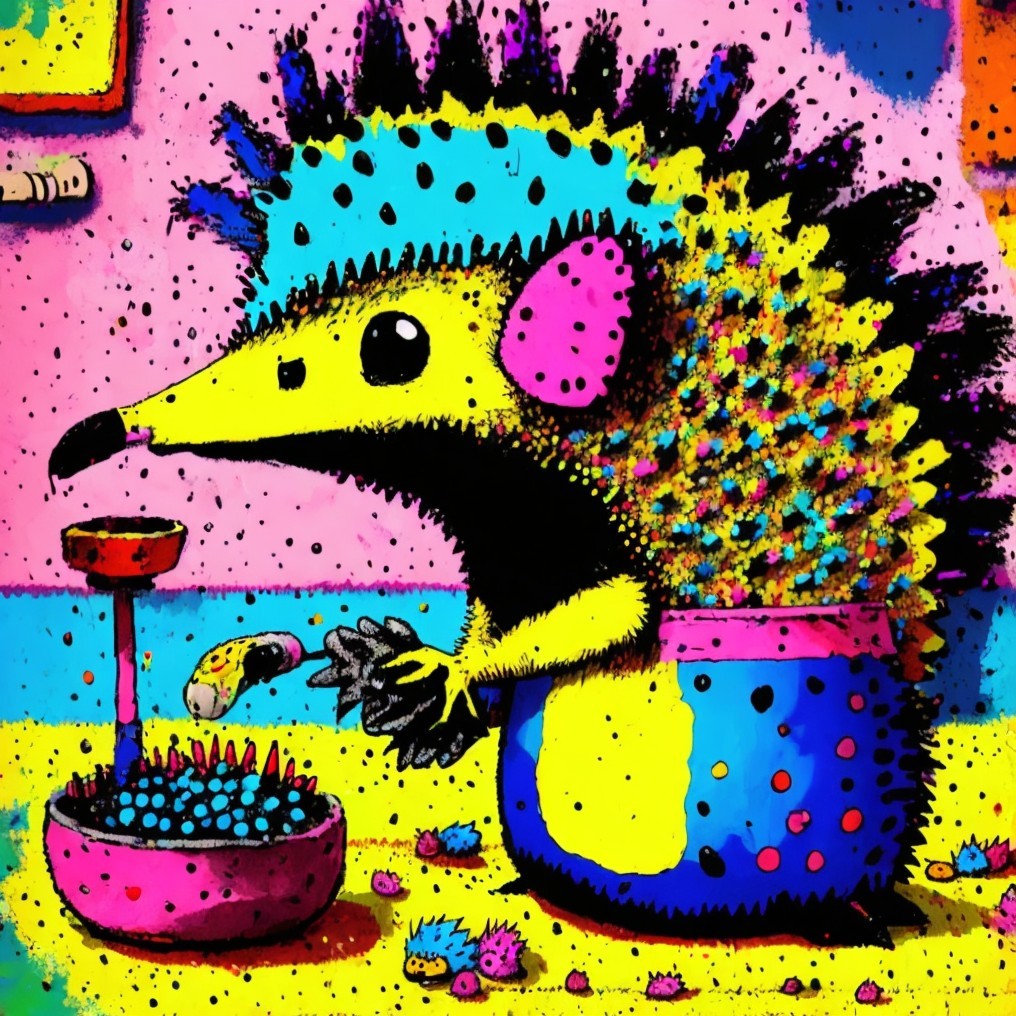 In a neon-colored, surreal kitchen, a hedgehog curiously operates a blender amidst a vibrant, playful environment. The hedgehog’s textured spines and bold colors pop against a backdrop of abstract shapes, creating a whimsical blend of pop art, psychedelic watercolors, and cartoonish charm.