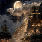 A serene night scene depicts a village illuminated by warm lights, nestled among rolling hills. A glowing moon casts reflections on a calm river, surrounded by lush trees and swirling clouds.