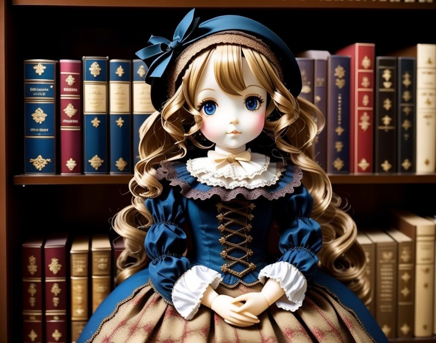 A porcelain doll with large blue eyes, curly hair, and a Victorian style blue and white dress, lies on grass with yellow flowers.