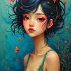 A young woman with flowing black hair adorned with vibrant orange flowers gazes softly. She wears a delicate teal top, surrounded by colorful blooms against a bright, serene backdrop.