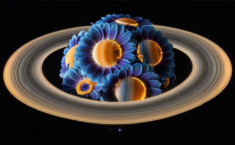 Smaller planets are the centers of individual blue flowers borders comprising a planet surrounded by saturn-like rings each with intensity, turgidity, frigidity, quiddity, torridity, placidity, lucidity, viscidity, amorality, erogeneity, floccosity, jocundity, irritomotility, parcentricity, metalleity, labiality, in the shape of a fractality; reflection, refraction, subsurface scattering, crepuscular light rays, smooth surface liquidity. raytracing. beazness