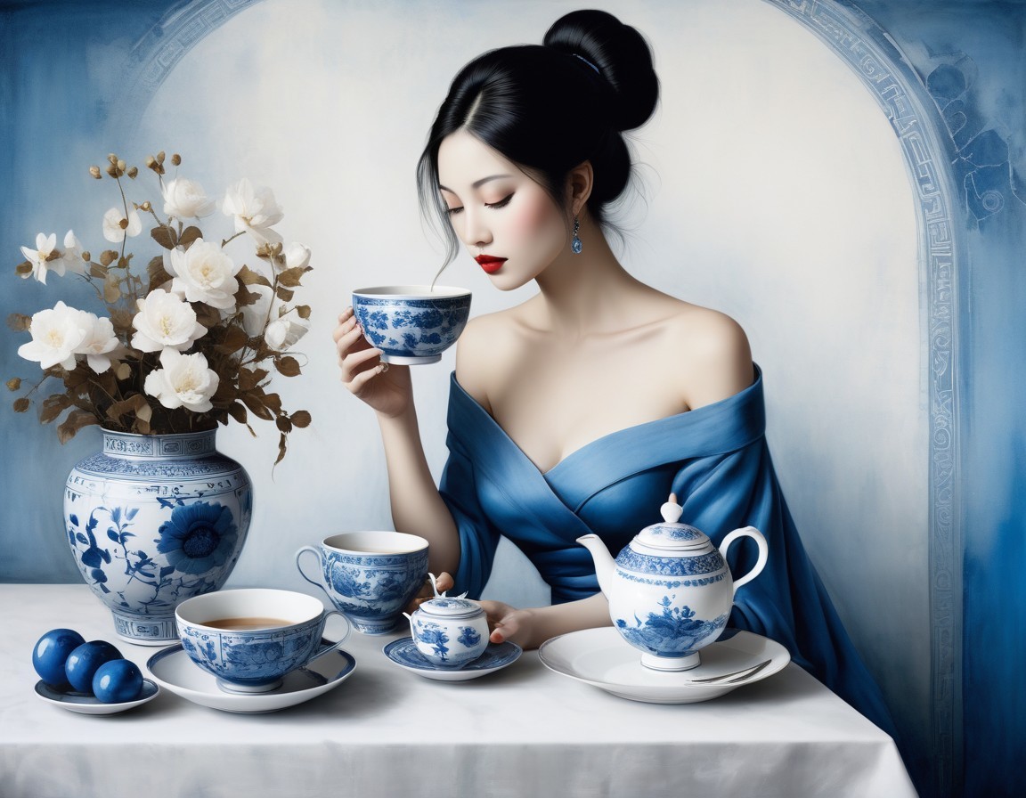 A woman in a blue dress sips tea among porcelain tea set with floral decor.
