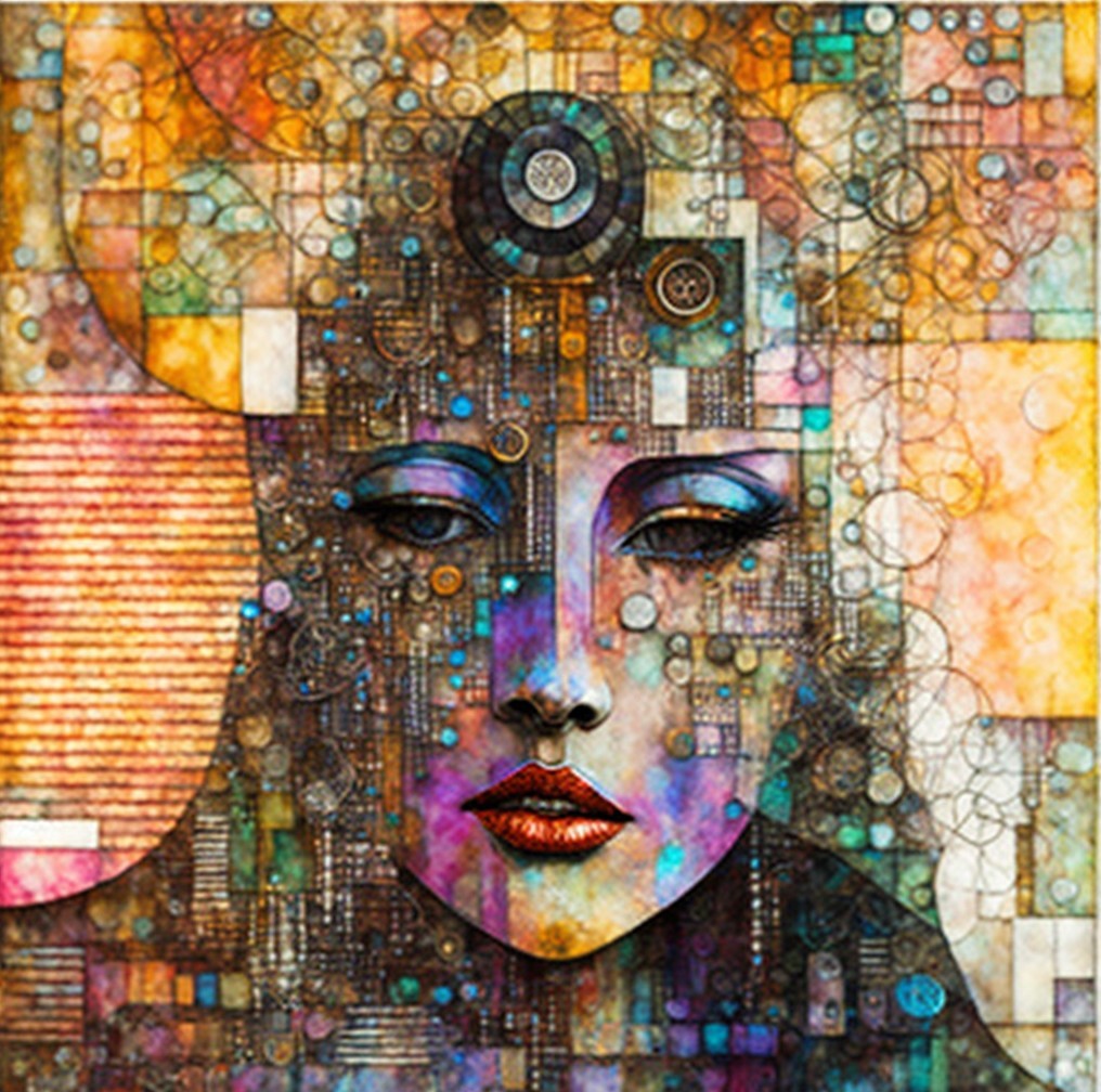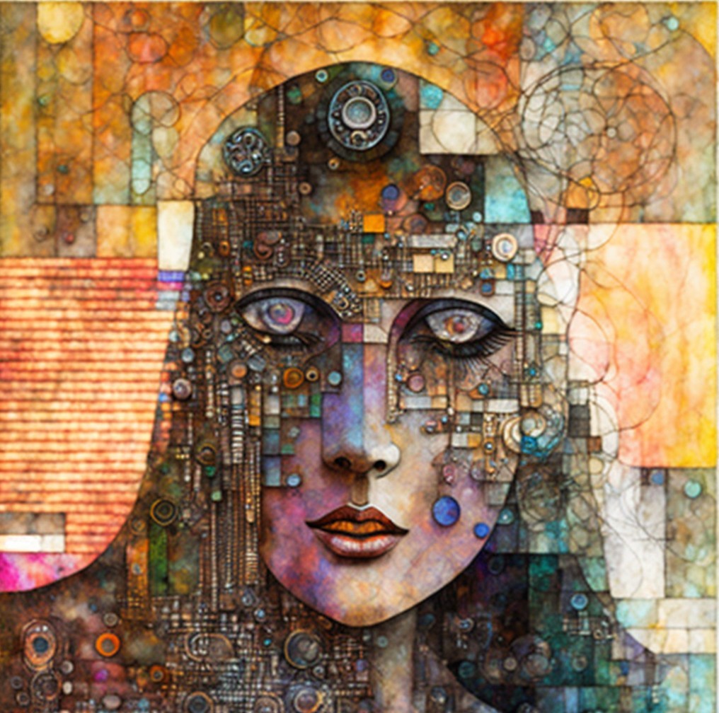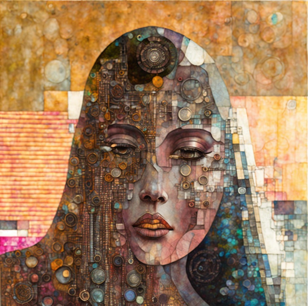 Woman's (base image face) portrait in patchwork watercolor and electronic parts, transistors, resistors, diodes, capacitors and wires, bright colors patina of ancient stone with moss, art brut, moody, somber, desaturated colors, in the style of Paul Klee, Arthur Rackham