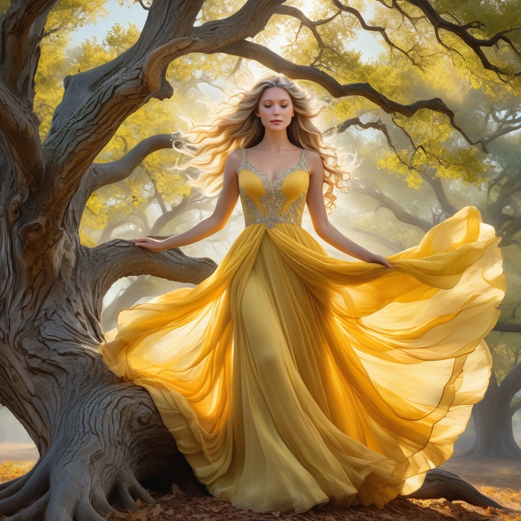 A young woman in a flowing yellow dress twirls gracefully in a mystical forest, surrounded by soft light and fluttering leaves, creating an enchanting and ethereal atmosphere.