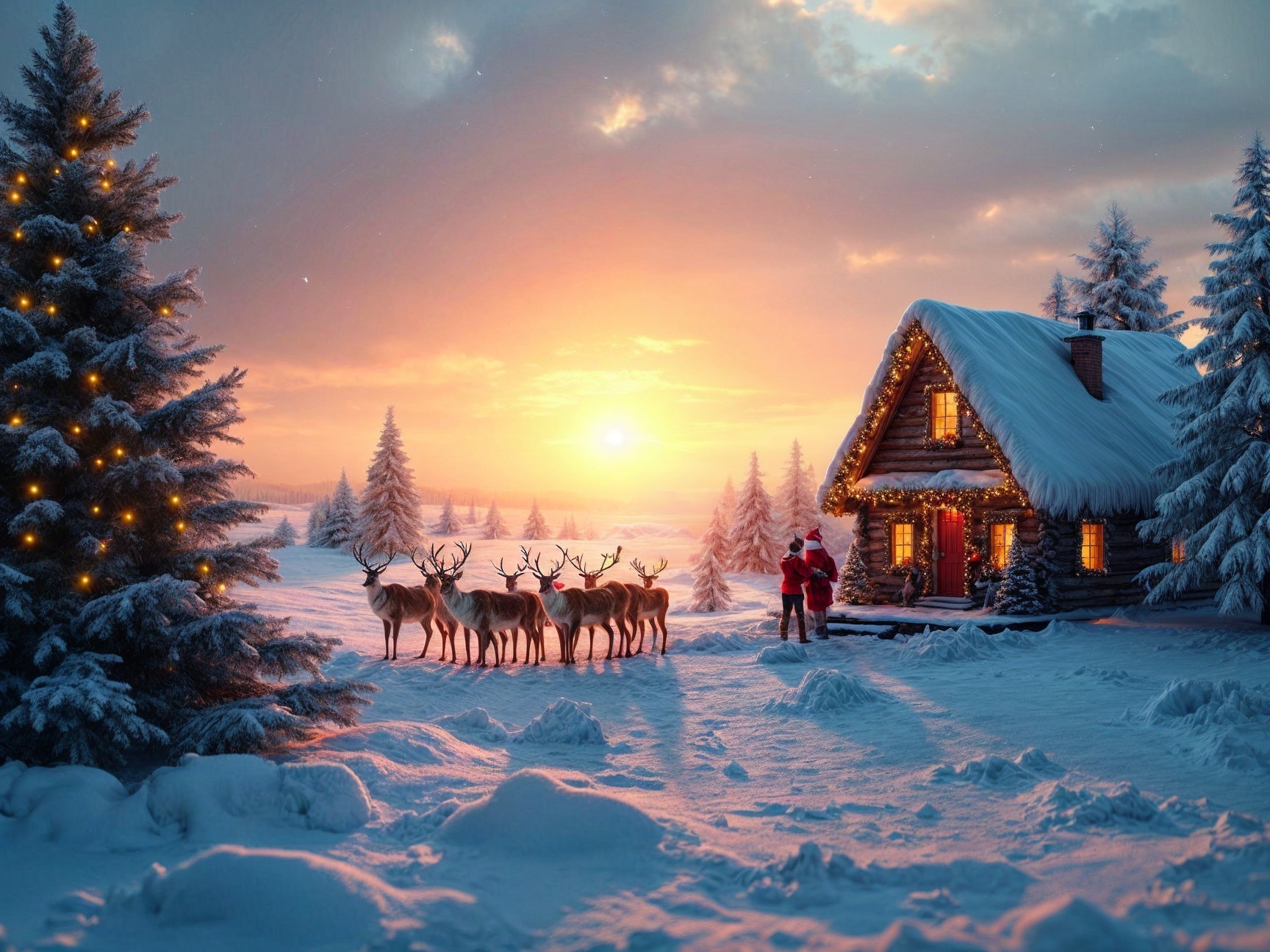 A picturesque winter scene featuring a cozy cottage surrounded by snow-covered trees. Decorated with lights, a large Christmas tree stands nearby, while reindeer wander in the serene landscape.