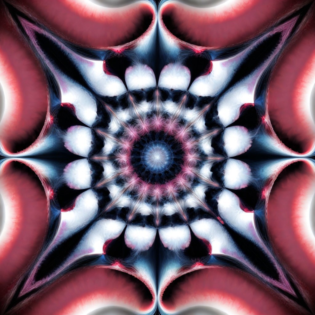 Symmetrical fractal pattern with radial design, featuring shades of black, red, and white, creating an optical illusion of depth.