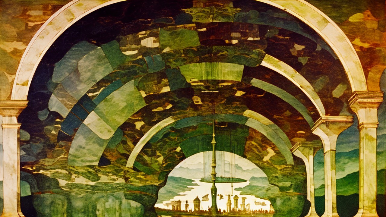A mesmerizing fantasy landscape features majestic arches opening to a serene river and ethereal castle in the distance, surrounded by lush greenery and soft clouds, evoking a sense of wonder.