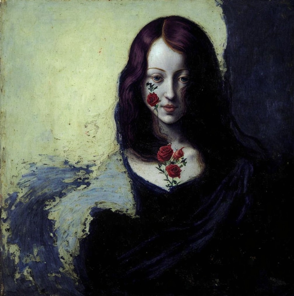 + Prompt:Generate a Botticelli oil painting of a beautiful, sensual, red headed, dark eyed woman in a dark purple and navy blue dress, with a bloody red rose clenched in her teeth. Painted with authentic brushstroke texture, emphasizing the clenched aesthetic in facial and body features. embracing the imperfections and aged feel reminiscent of a genuine masterpiece. Sensual woman, flowers in mouth, biting flowers, flowers between lips. Dark eyes.