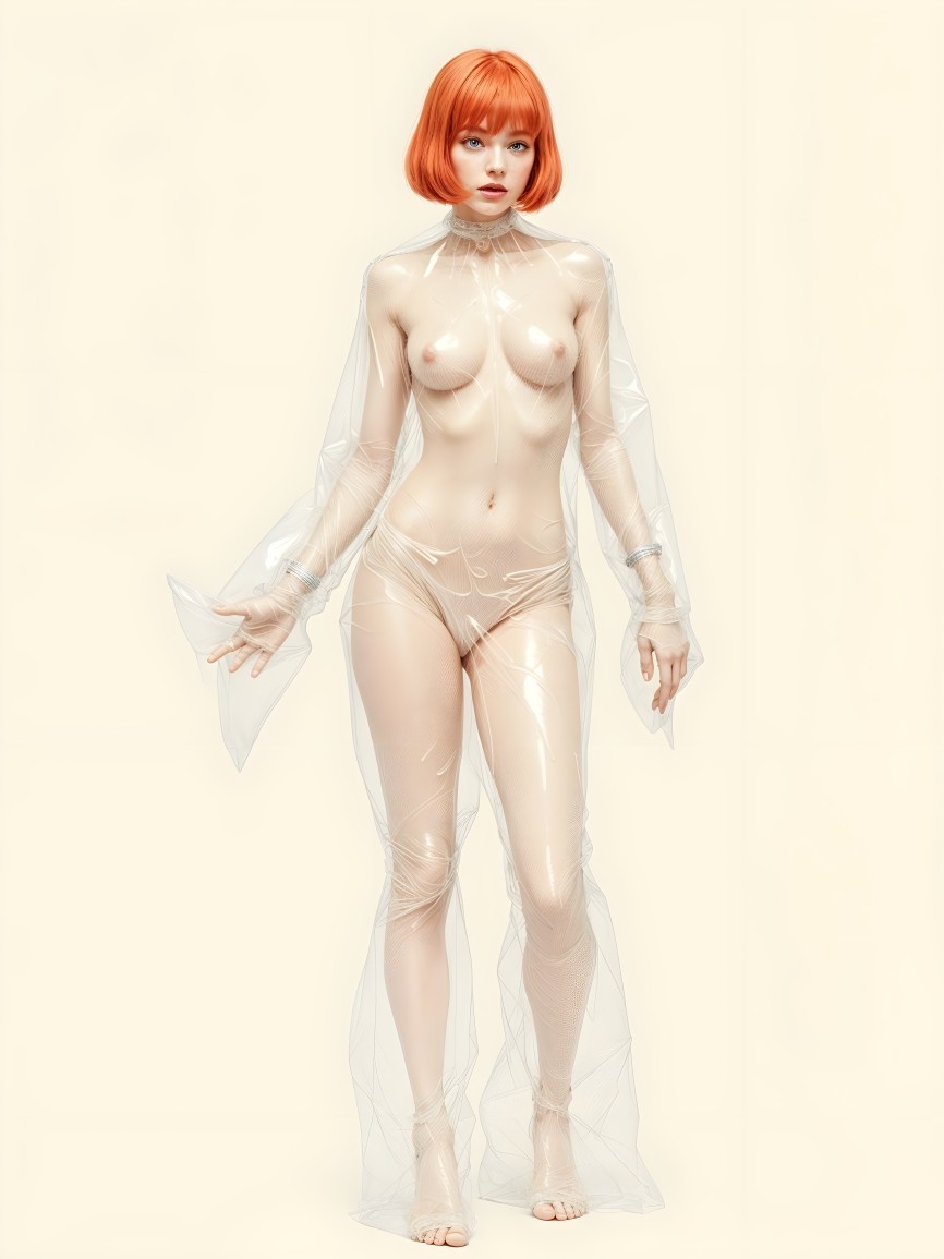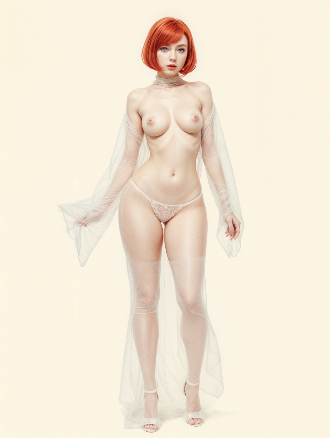A young woman with red hair poses against a neutral background, wearing a delicate outfit with headphones. She holds a cigarette and exudes a blend of elegance and modernity.