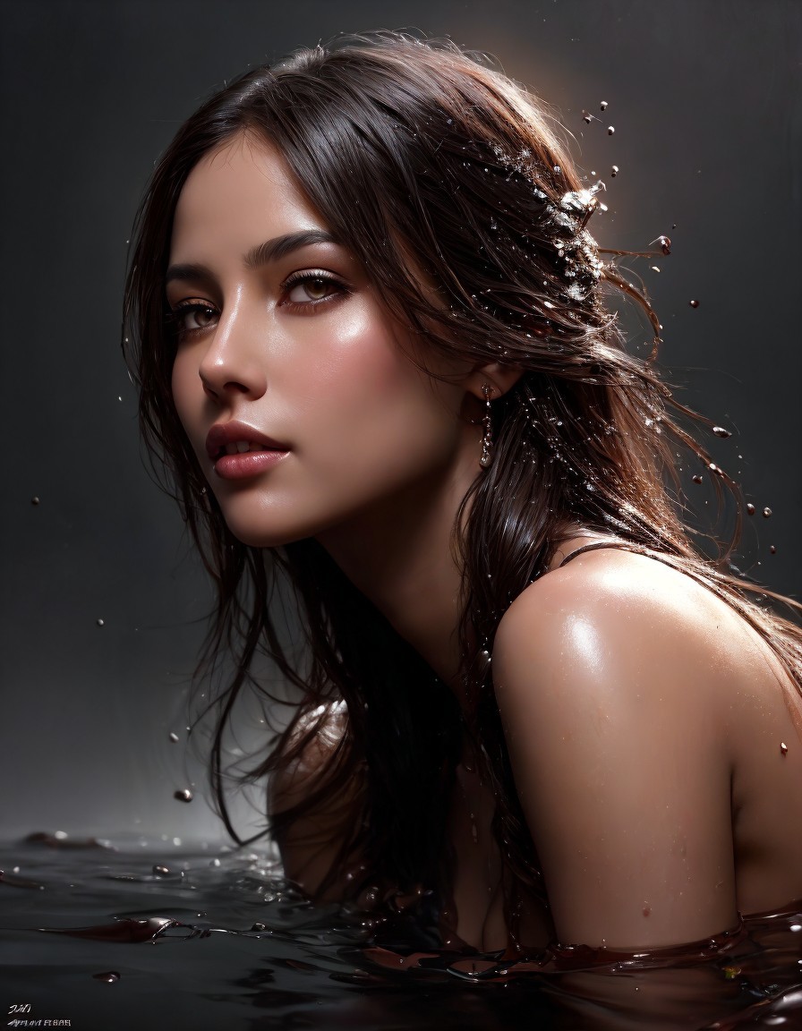 ("Try it" from Jaime Vives Piqueres)- A portrait of a woman with wet hair and skin, looking intensely with water droplets around her, set against a dark background.