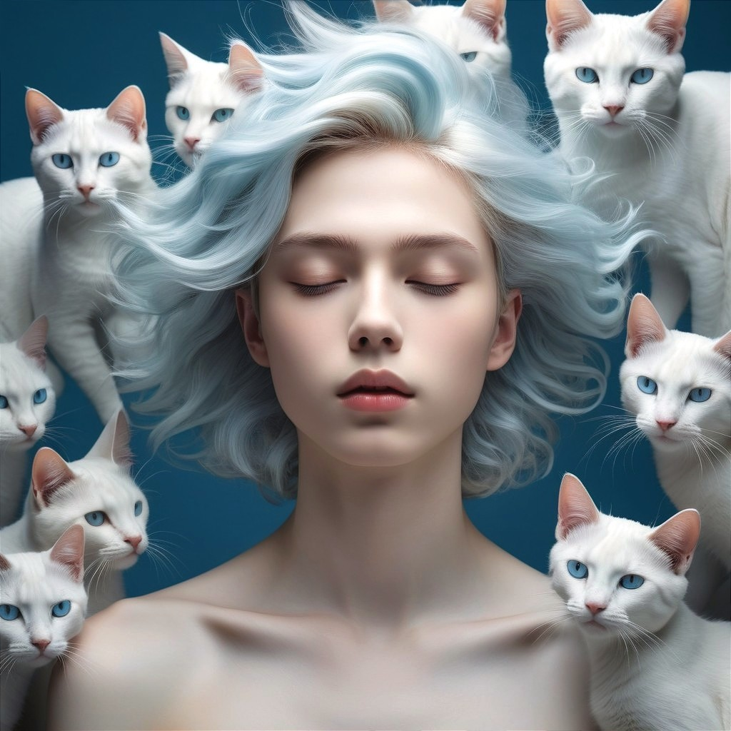 ("Try it" from GoBi) - A woman submerged in water with white cats that have piercing blue eyes floating around her, sharing a serene and dreamlike atmosphere.