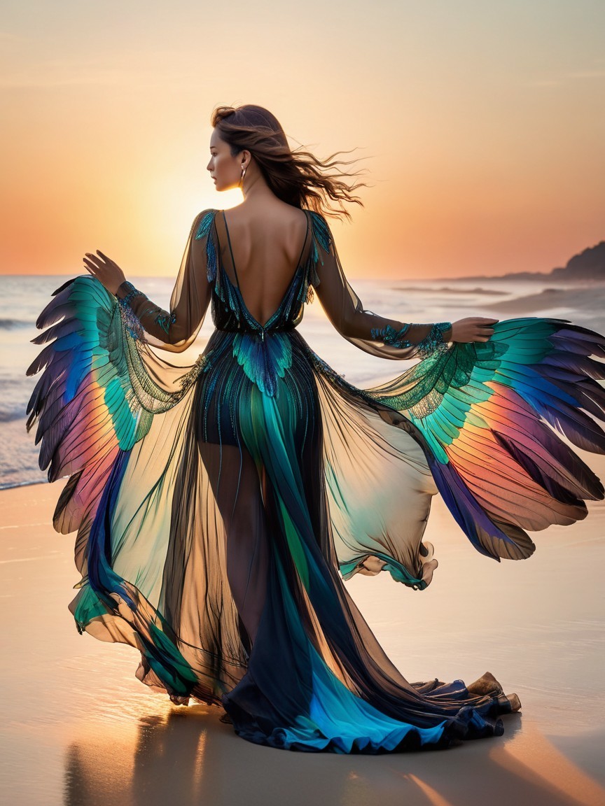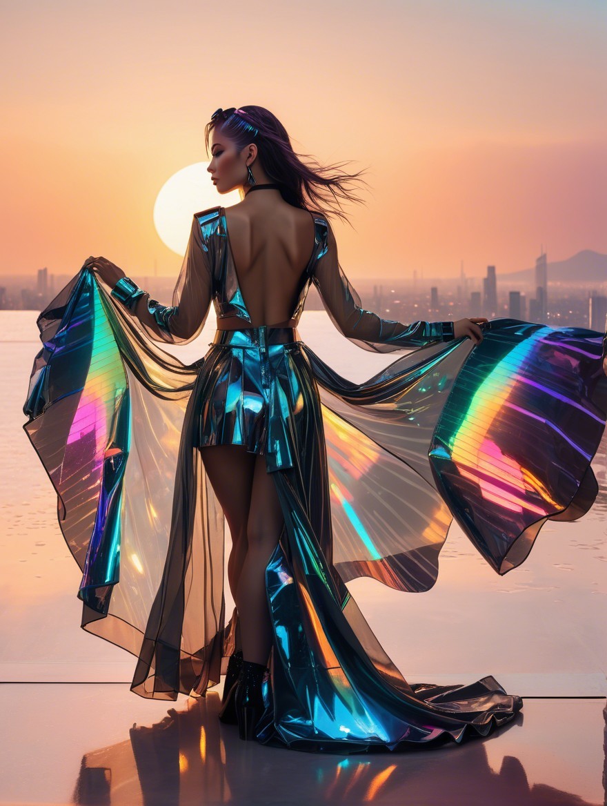 A striking figure poses by a window against a vibrant sunset, wearing a futuristic, iridescent outfit. Neon lights reflect off her stylish attire, creating a mesmerizing, urban vibe.