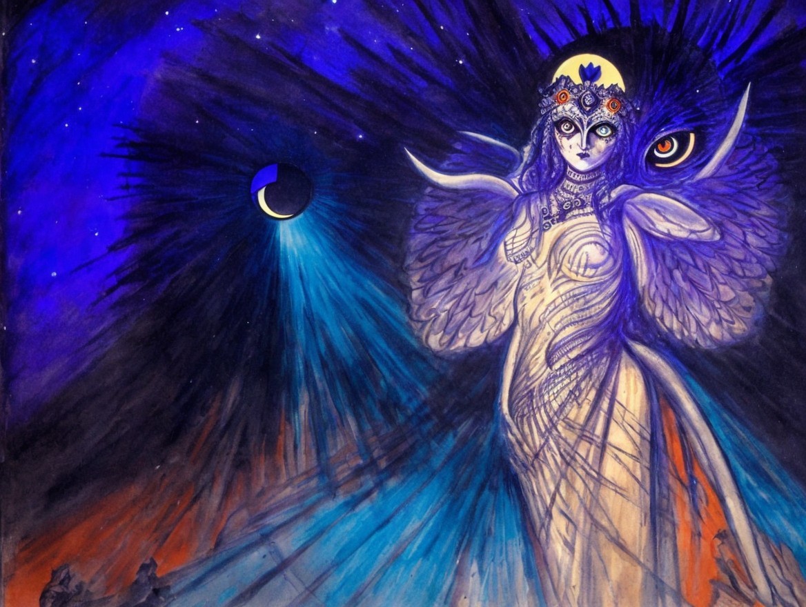 A mystical female figure with horns and wings stands before an abstract backdrop with colorful eyes and dynamic lines.