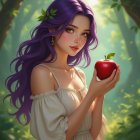 A young woman with flowing purple hair holds a shiny red apple in a sunlit forest. She wears a light, off-shoulder dress and gazes gently, surrounded by lush green foliage.