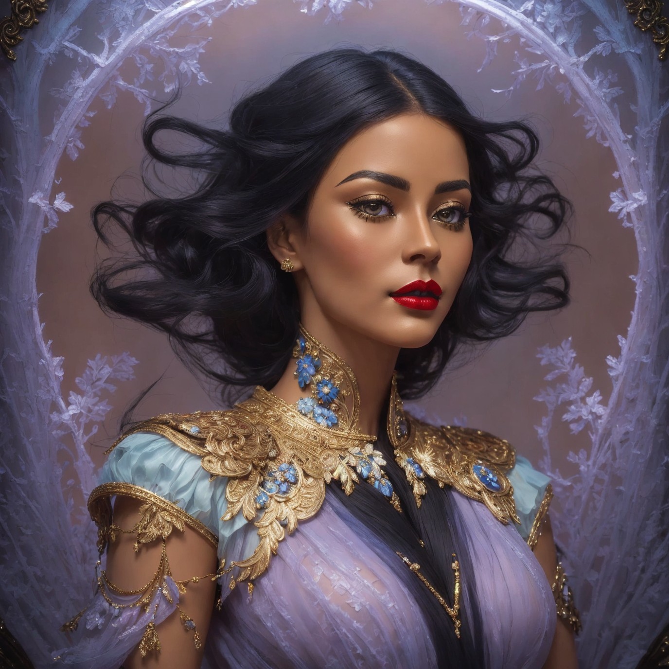 Dark-haired woman in blue and gold attire with red lipstick and traditional jewelry in frosty setting