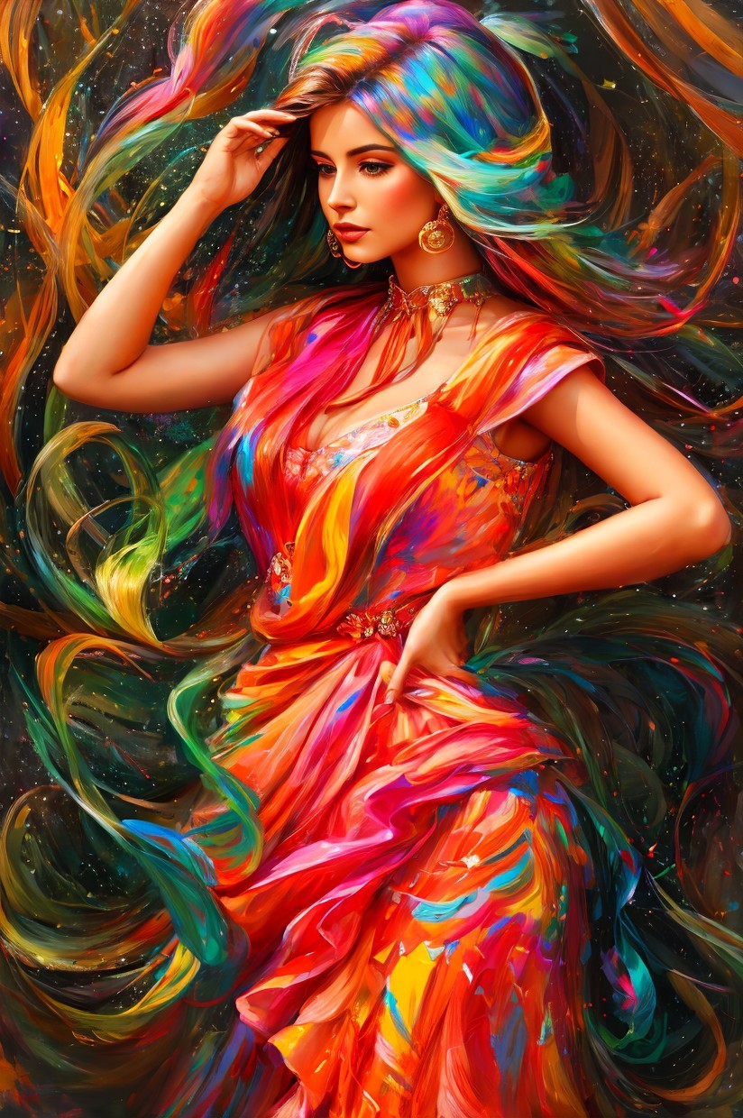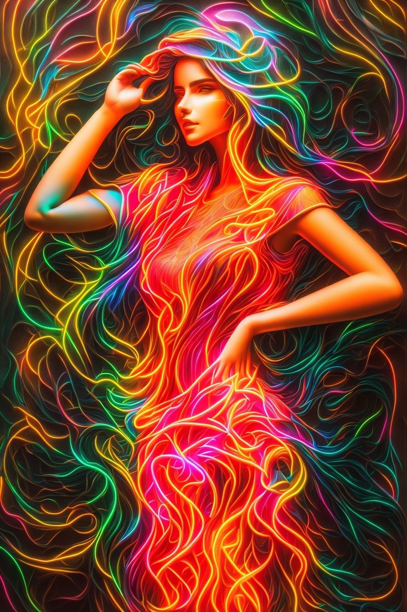 + Prompt:3d neon art of a woman, illuminated, looking at us, digital art, refined, elegant, key light, fill light, backlight, dramatic lighting, colorful, vibrant, dark, blended colors, large brush strokes, sense of depth, natural hair, professional, no watermark,