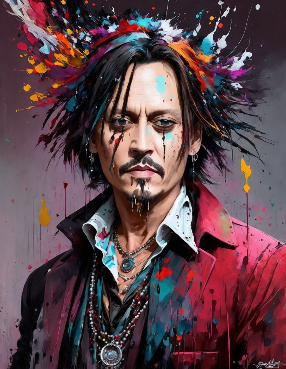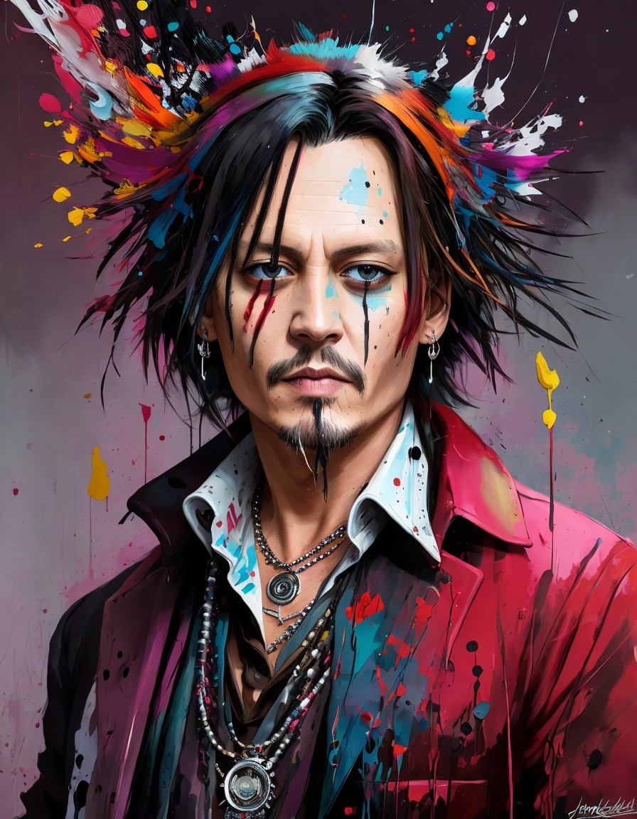 Prompt: crazy insane Johnny Depp ; Speedpaint with mixed brush strokes size by Junji Ito; robert oxley! Ismail Inceoglu; Gazelli; M.W. Kaluta; richard anderson; paint splatter; paint drips; drip painting; a masterpiece; 8k resolution; trending on artstation; maximalist; uncanny; Holi