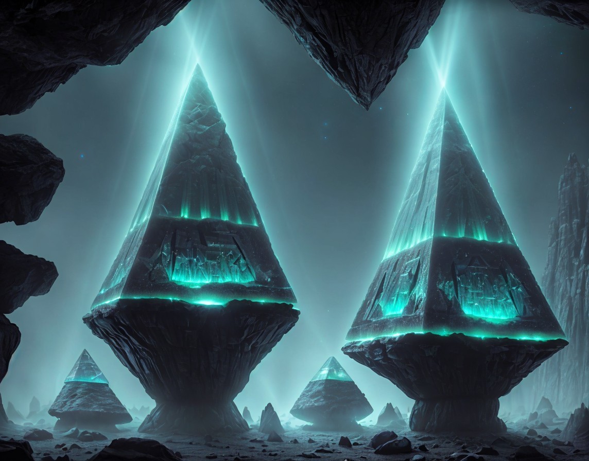 Prompt: Extraterrestrial bioluminescent menagerie pyramid intertwined with advanced alien technology in an eerie and mystical dark foggy forest landscape with large boulders inscribed with runes and cliffs. Pyramid surrounded by colossal crystals. UFO in front of 3D-rendered bioluminescent mushrooms and colossal crystals. sacred geometry, mystical occult imagery (hamsa, eye of providence), talismans, esoteric tarot cards, and the all-seeing eye. Realistic and natural elements, under a cosmic sky. alien plants, psychedelic elements like galactic DMT entities, hallucinogenic vibes, shamanic horror LSD art, and the ethereal DMT realm. In the style of Cameron Gray