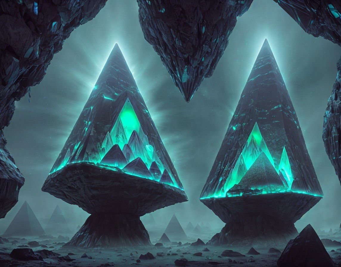 + Prompt:Extraterrestrial bioluminescent menagerie pyramid intertwined with advanced alien technology in an eerie and mystical dark foggy forest landscape with large boulders and cliffs. Pyramid surrounded by colossal crystals. UFO in front of 3D-rendered bioluminescent mushrooms and colossal crystals. sacred geometry, mystical occult imagery (hamsa, eye of providence), talismans, esoteric tarot cards, and the all-seeing eye. Realistic and natural elements, under a cosmic sky. alien plants, psychedelic elements like galactic DMT entities, hallucinogenic vibes, shamanic horror LSD art, and the ethereal DMT realm. In the style of Cameron Gray