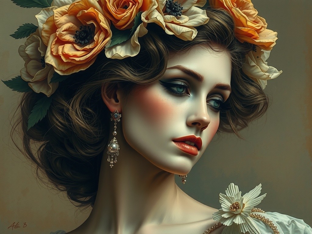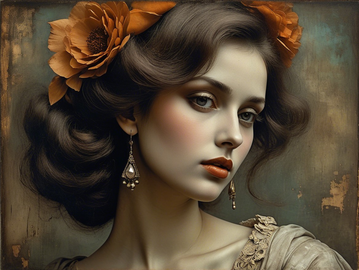 A vintage-style portrait of a woman with wavy hair, a wide-brimmed hat, and a striking gaze against a textured backdrop.