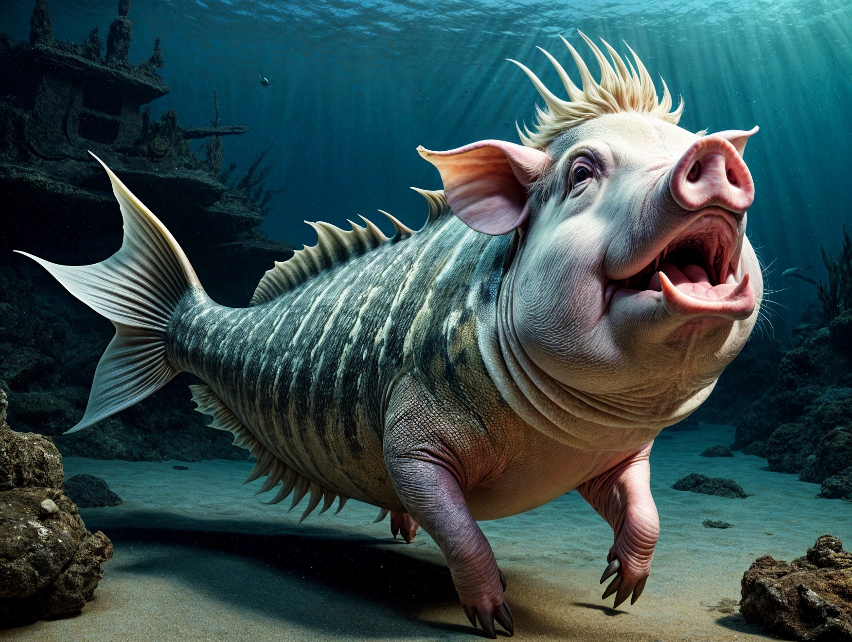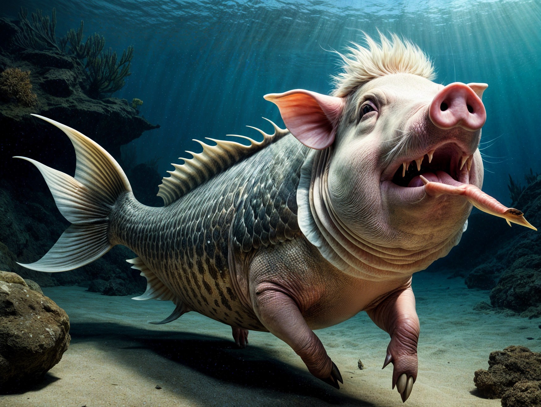 A surreal underwater creature combines features of a fish and a pig, with a scaly body, a pig-like snout, sharp teeth, and vibrant fins, swimming amidst rocky underwater landscapes.