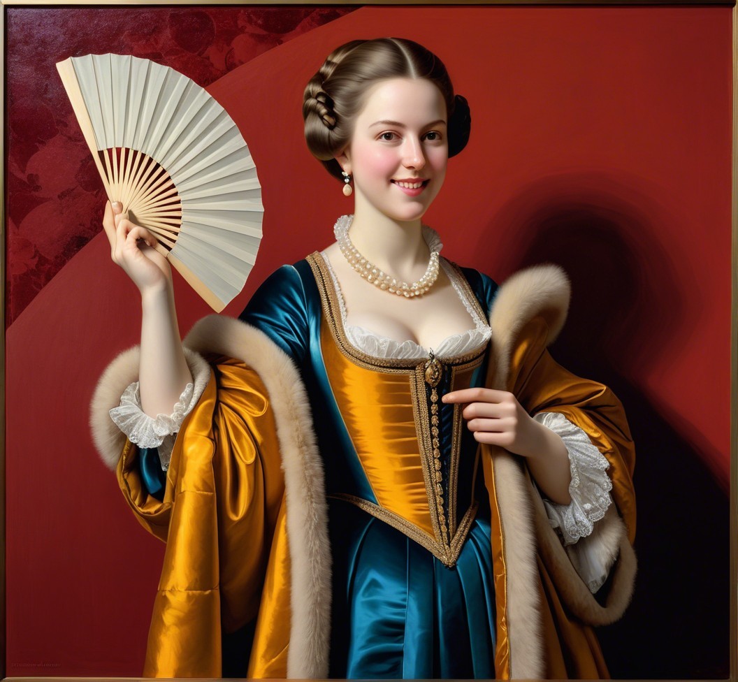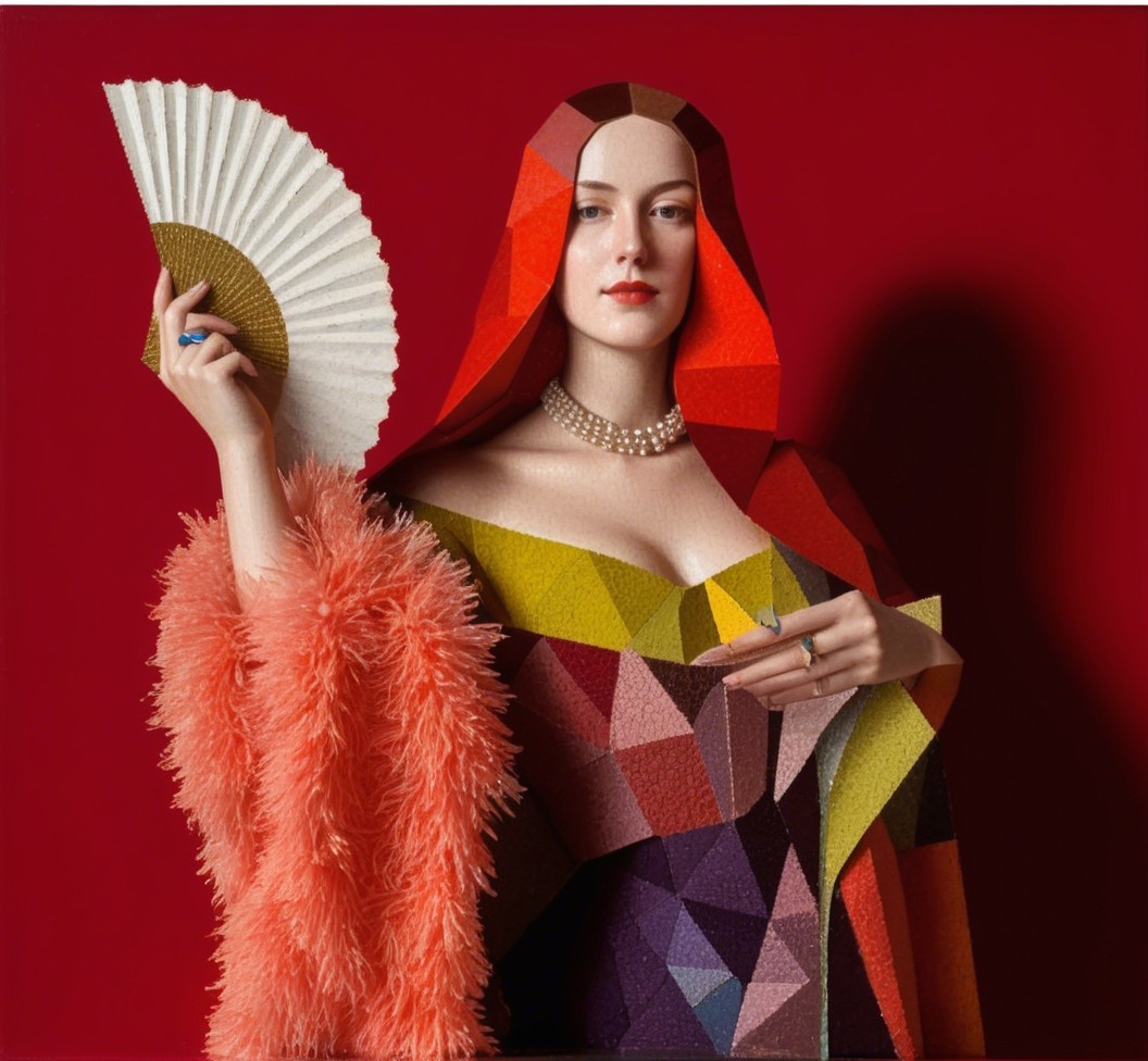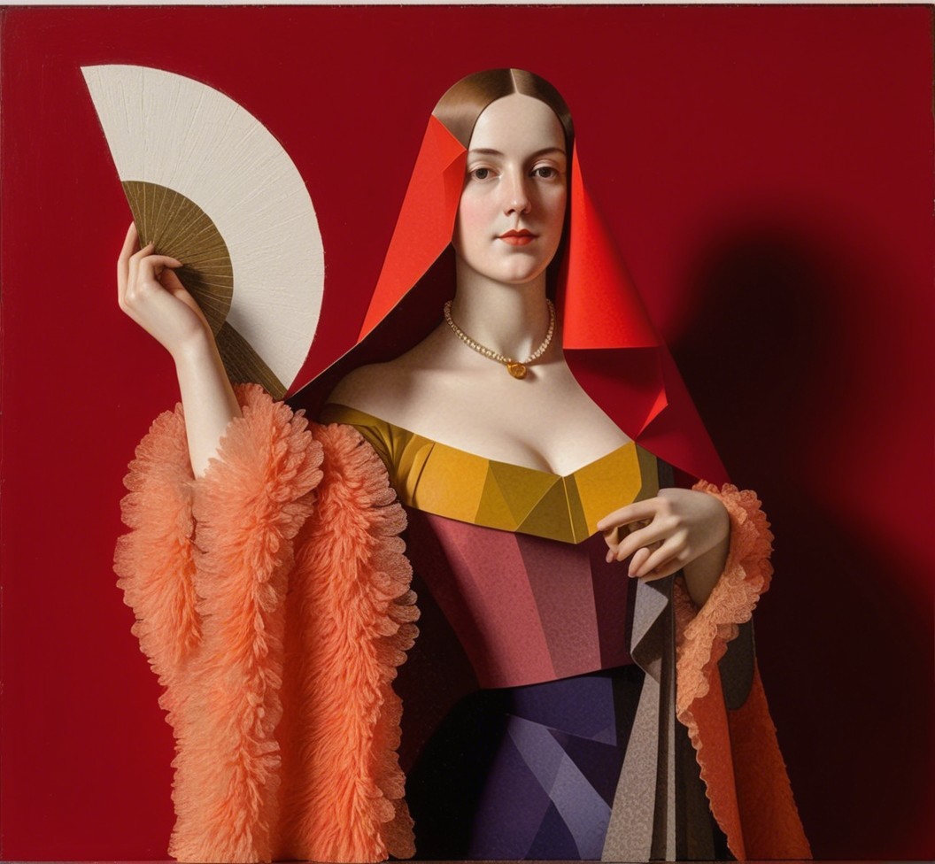 Prompt: Angular geometric portrait by Benno Hauber and Ho Baron, juvenile female in furs with a hand fan, baroque tints of Patrick Henry Bruce, reflection mapping 1.6, complexing 1.3, REALpix technique, path tracing 1.4, enlarged head, panels mosaic, indiecore, juminocore, slightly exaggerated features, smirky duchenne smile, estranged diffused lighting 1.4, orphism detailed clothing, paper-cut art reminiscence, gradient inking colors, single abstracted vignette in colored ink and oil by Man Ray, impossible light transitions, slightly comical, dainty, lavish, buxom, etched details, primary colors, unique, cel-shading, wet-on-wet technique, liminal spaces, tall and lean details, flares, visible textures, painterly style with bold brushstrokes by Brandon Mably, dyed, subsurface scattering 1.3, brightness 1.9, parallax occlusion 1.3, raytraced shadows 1.3, complexion 1.2, quilling, unity, natural, mystical, hand-drawn illustration style, opalescent color shapes, translucent, back-lit, abstract post-avantgarde by Stan Lee, dof, bokeh, debeh, negative lucas numbers, iridescent art sketch, colorful close up image, reminiscent of Gil Bruvel, stylized by Brian Jongen and Renny Tait, collagraphy, high plasticity akin to woodblock print featuring a stylized portrait with a juvenile essence, printmaking-inspired illustration, dynamic gradient coloring, created in the merged styles of William Bradley, Arthur Rackham, Man Ray, Gil Bruvel, embodiment by Luis Royo, detailed and expressive, warm and cool color palette, dramatic lighting effects. Drawing inspiration from Gil Bruvel, Iwona Lifsches, Ho Baron, double-exposure, sfumato, geometrical styles and foampunk influences, simplistic yet romantic abstraction, artwork inspired by Frank Frazetta, patchwork theme, posh, dof, several layers of fabric that blend with luminism, plasticity 1.6, crisp quality using Unreal Engine, parallax occlusion. mosaic, hues by Brad Kunkle, tesselation in post-expressionistic style, coffinwood-style 1.3, novelty architecture, daring and provocative, fusion of stylized orphism and line art, plasticity 1.3, Juminocore psychedelia, wavery texture patchwork, pellucid details, grunge, fusion art concept, stylized chipped patchwork, pastel colors, headshot, precise Gelsculpt 64K rendering,octane render illustration, luminosity 1.3, brightness 1.8, hypermaximalist surrealism by Renny Tait and Lyonel Feininger and Ilya Zomb,