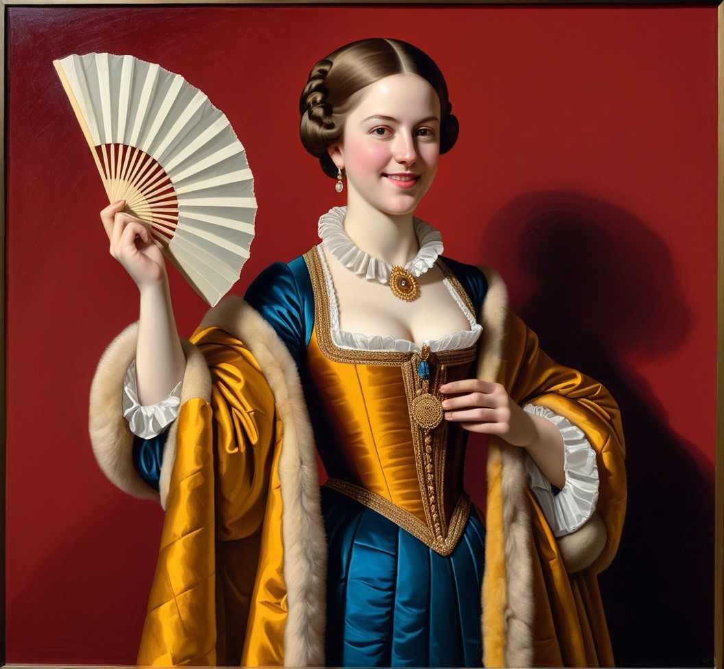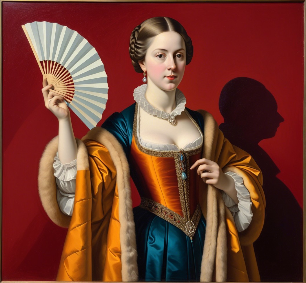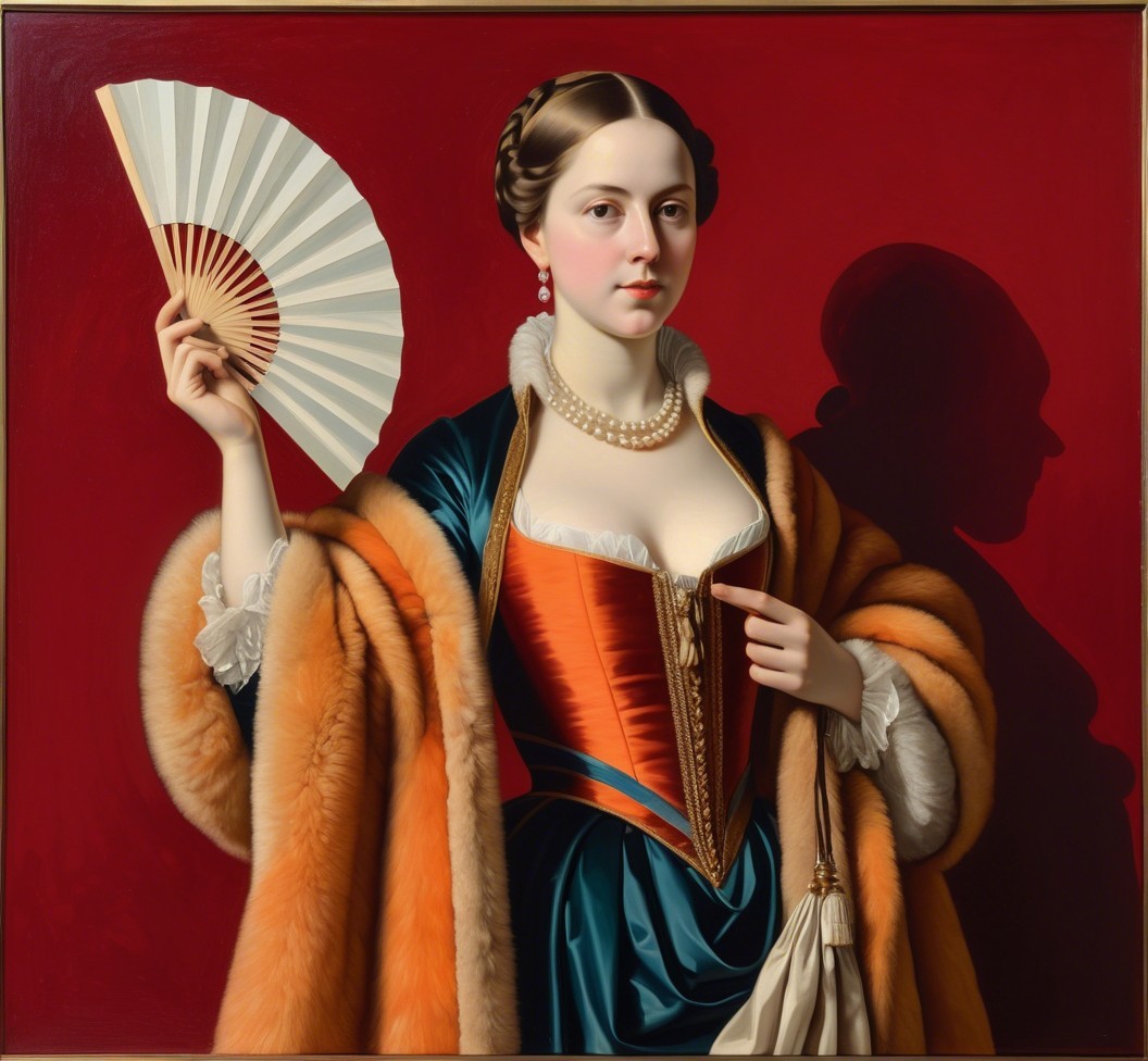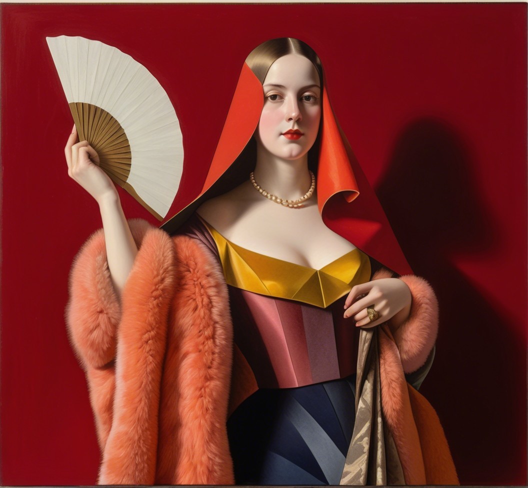 Angular geometric portrait by Benno Hauber and Ho Baron, juvenile female in furs with a hand fan, baroque tints of Patrick Henry Bruce, reflection mapping 1.6, complexing 1.3, REALpix technique, path tracing 1.4, enlarged head, panels mosaic, indiecore, juminocore, slightly exaggerated features, smirky duchenne smile, estranged diffused lighting 1.4, orphism detailed clothing, paper-cut art reminiscence, gradient inking colors, single abstracted vignette in colored ink and oil by Man Ray, impossible light transitions, slightly comical, dainty, lavish, buxom, etched details, primary colors, unique, cel-shading, wet-on-wet technique, liminal spaces, tall and lean details, flares, visible textures, painterly style with bold brushstrokes by Brandon Mably, dyed, subsurface scattering 1.3, brightness 1.9, parallax occlusion 1.3, raytraced shadows 1.3, complexion 1.2, quilling, unity, natural, mystical, hand-drawn illustration style, opalescent color shapes, translucent, back-lit, abstract post-avantgarde by Stan Lee, dof, bokeh, debeh, negative lucas numbers, iridescent art sketch, colorful close up image, reminiscent of Gil Bruvel, stylized by Brian Jongen and Renny Tait, collagraphy, high plasticity akin to woodblock print featuring a stylized portrait with a juvenile essence, printmaking-inspired illustration, dynamic gradient coloring, created in the merged styles of William Bradley, Arthur Rackham, Man Ray, Gil Bruvel, embodiment by Luis Royo, detailed and expressive, warm and cool color palette, dramatic lighting effects. Drawing inspiration from Gil Bruvel, Iwona Lifsches, Ho Baron, double-exposure, sfumato, geometrical styles and foampunk influences, simplistic yet romantic abstraction, artwork inspired by Frank Frazetta, patchwork theme, posh, dof, several layers of fabric that blend with luminism, plasticity 1.6, crisp quality using Unreal Engine, parallax occlusion. mosaic, hues by Brad Kunkle, tesselation in post-expressionistic style, coffinwood-style 1.3, novelty architecture, daring and provocative, fusion of stylized orphism and line art, plasticity 1.3, Juminocore psychedelia, wavery texture patchwork, pellucid details, grunge, fusion art concept, stylized chipped patchwork, pastel colors, headshot, precise Gelsculpt 64K rendering,octane render illustration, luminosity 1.3, brightness 1.8, hypermaximalist surrealism by Renny Tait and Lyonel Feininger and Ilya Zomb,