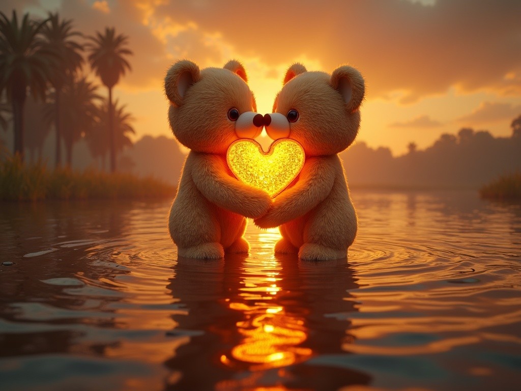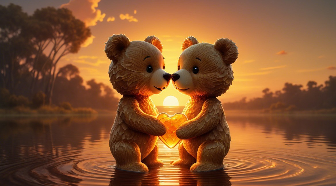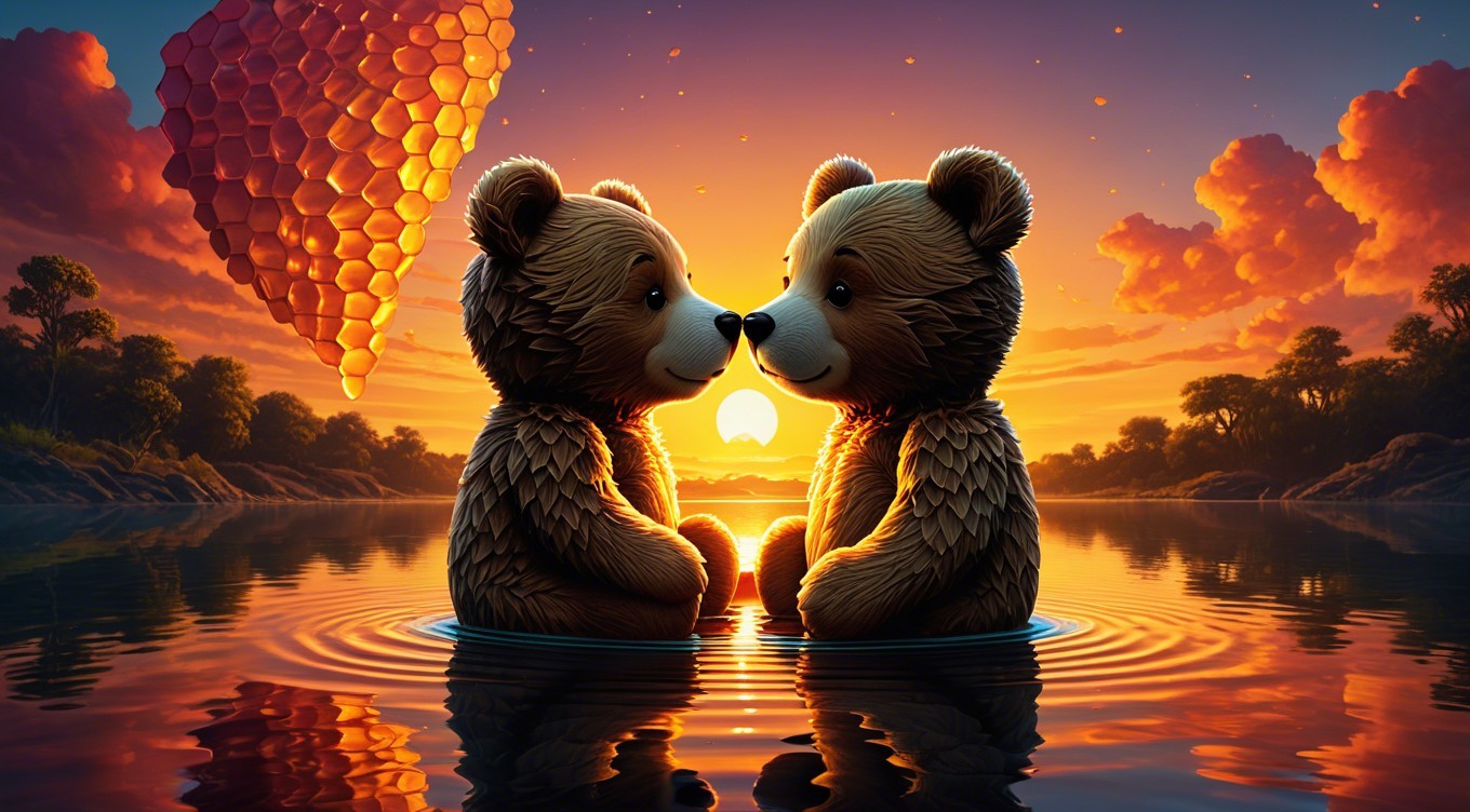 Two animated bears sitting nose-to-nose by a serene lake at sunset, with vibrant sky and clouds reflected in the water.