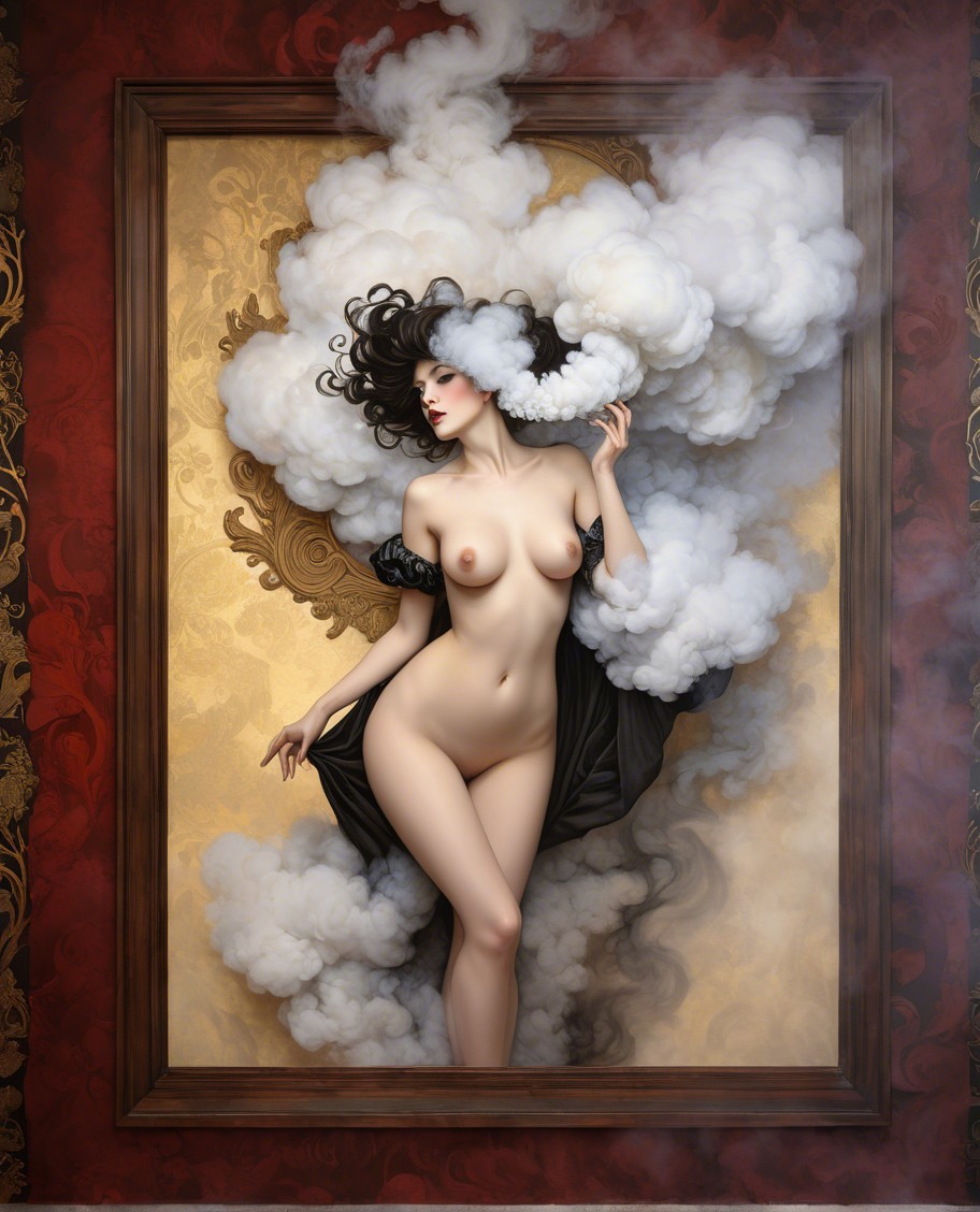 A striking figure in a stunning black outfit stands amidst swirling clouds of smoke. The dramatic lighting highlights her silhouette, creating a mysterious and enchanting atmosphere.