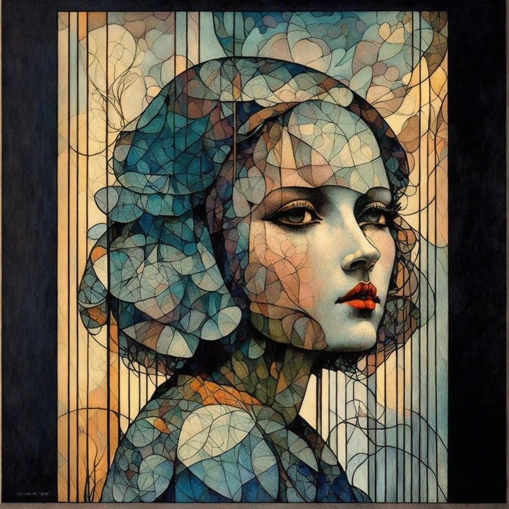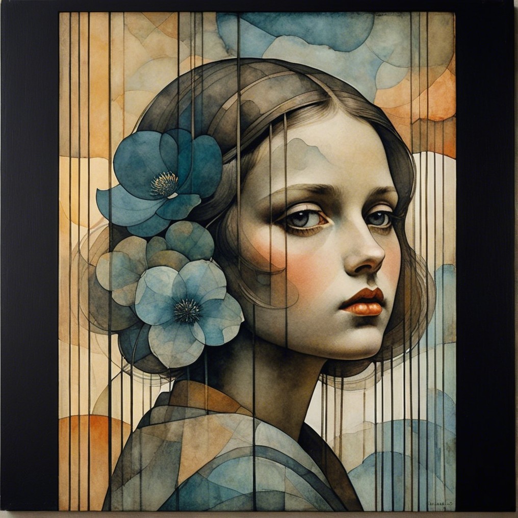 The artwork features a serene young woman with flowing hair adorned with blue flowers. Abstract shapes and soft colors create a dreamlike background, enhancing her contemplative expression.