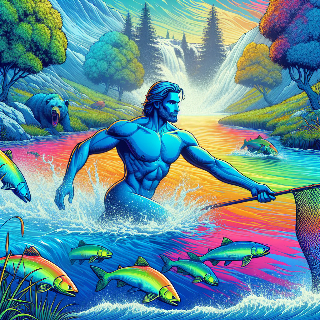 Prompt: "Vibrant colors, overlapping hues, high contrast, fluorescent river water, aggressive flow of fluorescent blue stream, handsome man in water catching salmon swimming upstream, 3D effect with splashing water, wet and determined man with net, perfect body proportions, grassy river banks, lush trees, bear emerging from forest, digital illustration, detailed and realistic, dynamic lighting, vivid color palette, nature-inspired, by Aaron Blaise, Artstation."