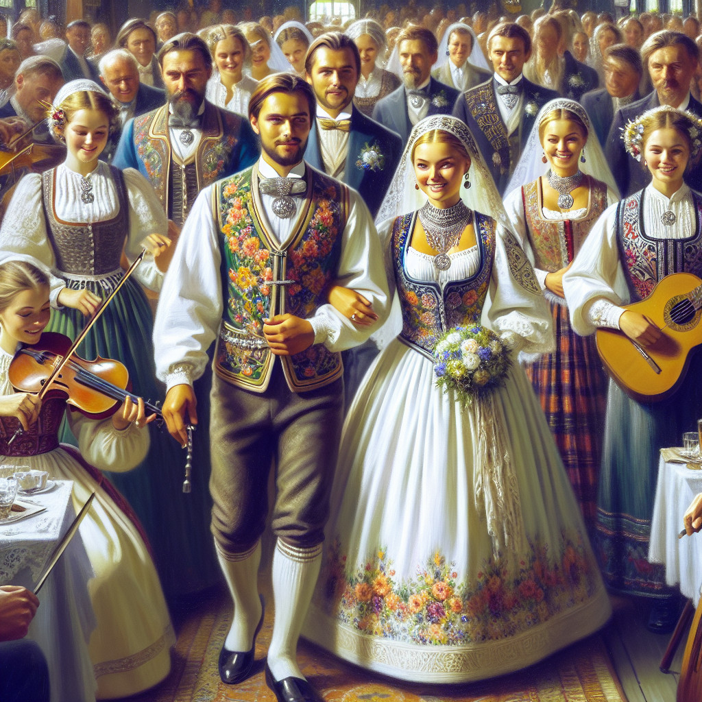 I was trying to create an image from one of my favorite pieces of music: Wedding Day at Troldhaugen by Edvard Grieg. The traditional wedding attire is called the Bunad and there are many different variations.