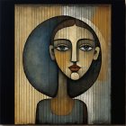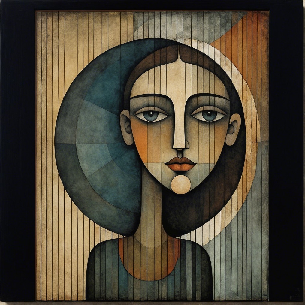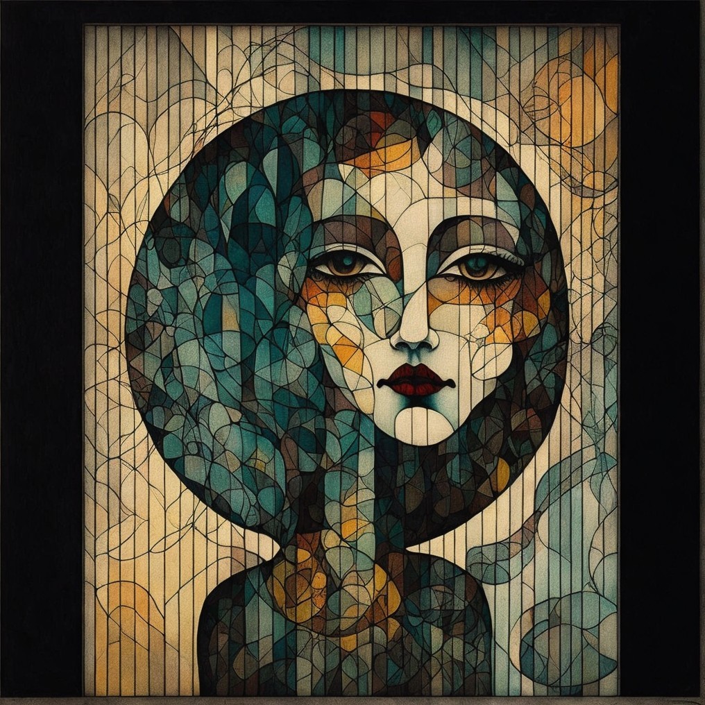 The image features a stylized portrait of a girl with large eyes and a thoughtful expression. Her dark hair cascades around a floral design, set against a textured, abstract background.