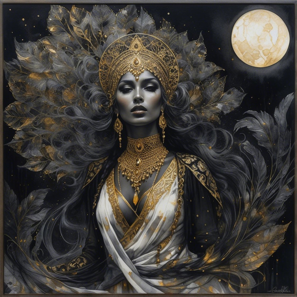 A mystical figure adorned in intricate golden jewelry and a flowing gown, surrounded by dark, leafy patterns. The full moon casts a serene glow, enhancing the ethereal atmosphere.